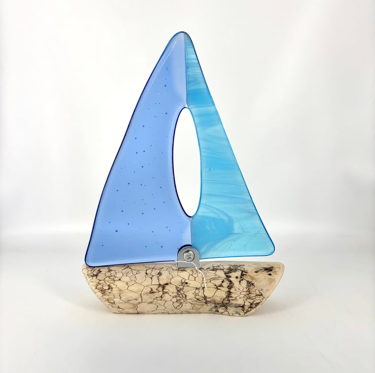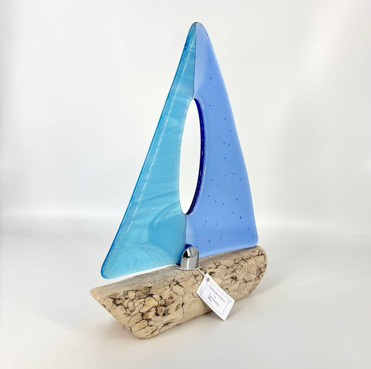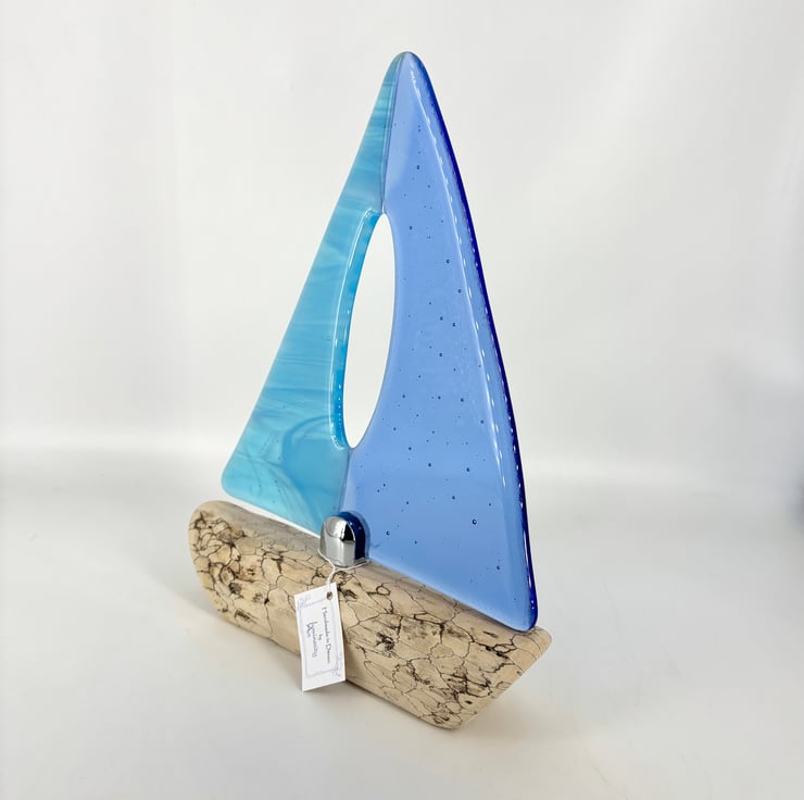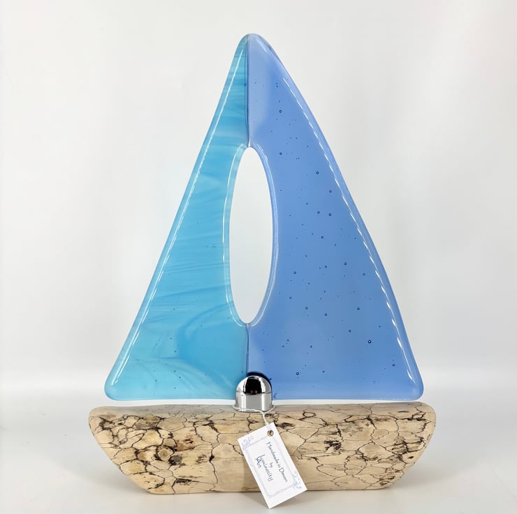 A beautiful decorative sailing boat. Gorgeous wispy turquoise and pale blue fused glass sails attached with a chrome fixing to a piece of spalted drift wood which had been washed up on the Devon coast.