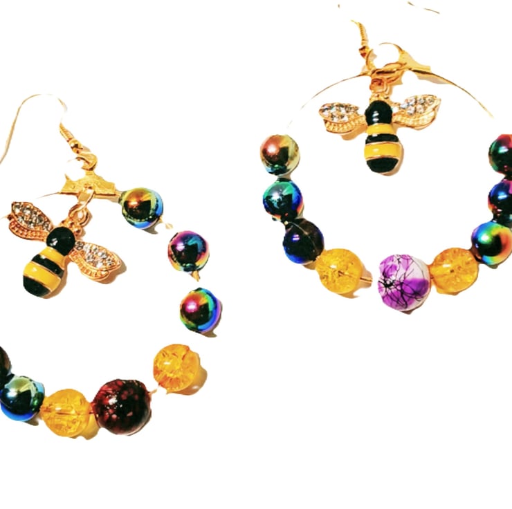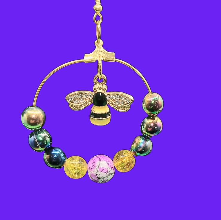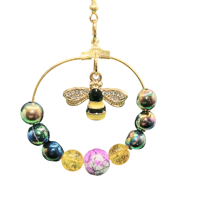 The playful bead arrangement adds a unique, handcrafted feel, while the warm gold tones of the hoop and bee create an elegant contrast.