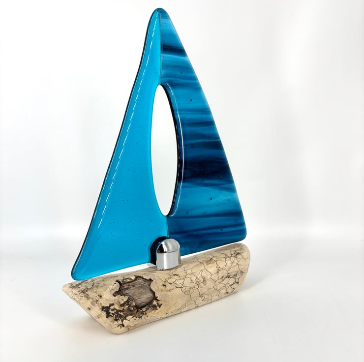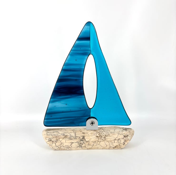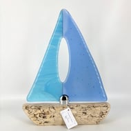 A gorgeous decorative sailing boat. Beautiful deep turquoise and turquoise wispy fused glass sails attached with a chrome fixing to a stunning piece of drift wood which had been washed up on the Devon coast.