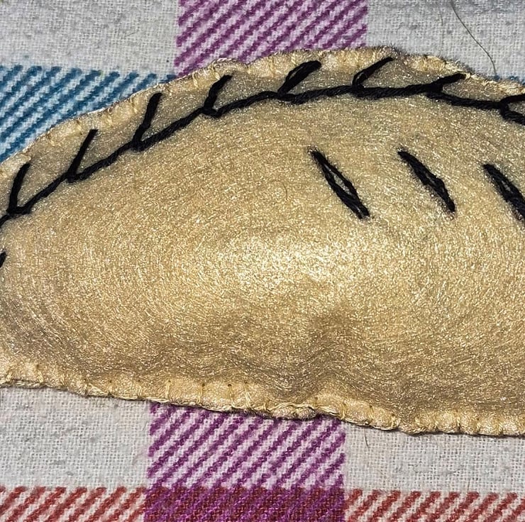 Made using soft felt and embroidery thread, this pasty is lightweight and tactile, making it perfect as a novelty decoration, gift, or display piece. Each one is handmade individually, giving it its own unique charm and slight variations.