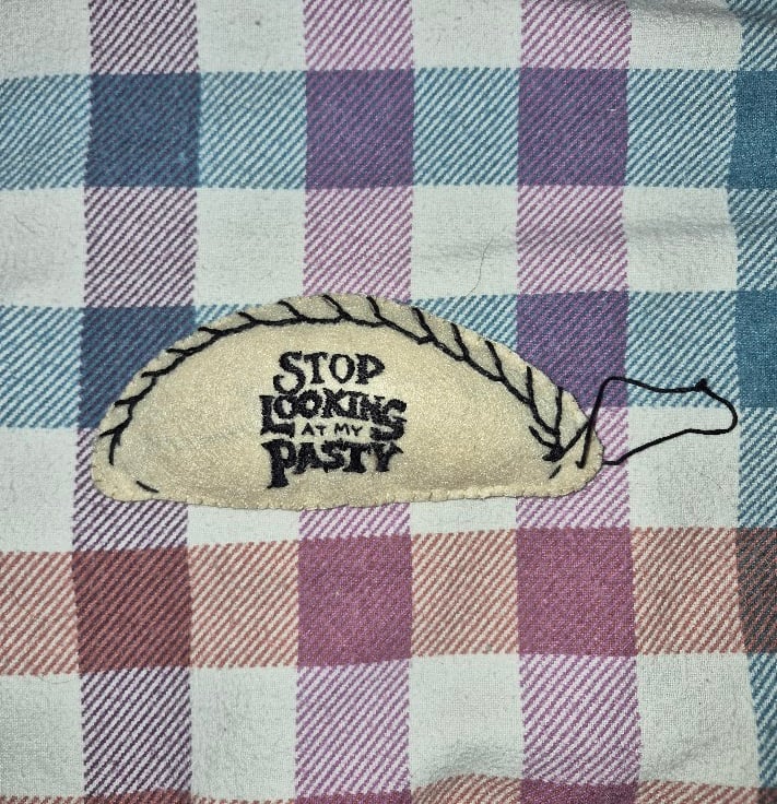 This handmade felt pasty has been carefully stitched and embroidered by hand, featuring the cheeky phrase “Stop Looking at My Pasty” in bold black lettering. Designed to resemble a classic pasty shape, complete with stitched crimping detail, it’s a fun and characterful decorative piece.
