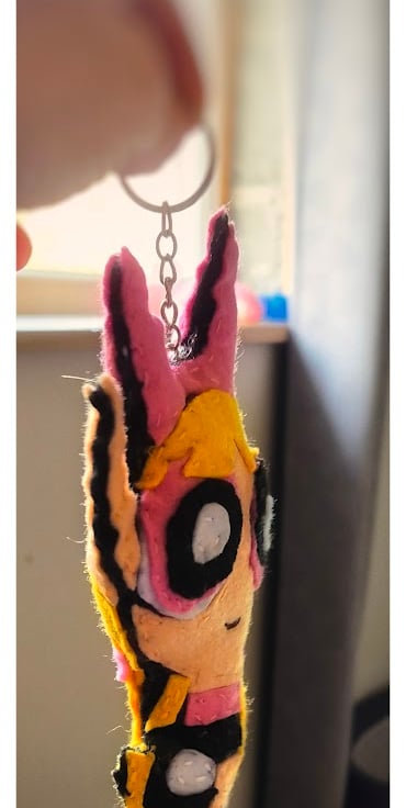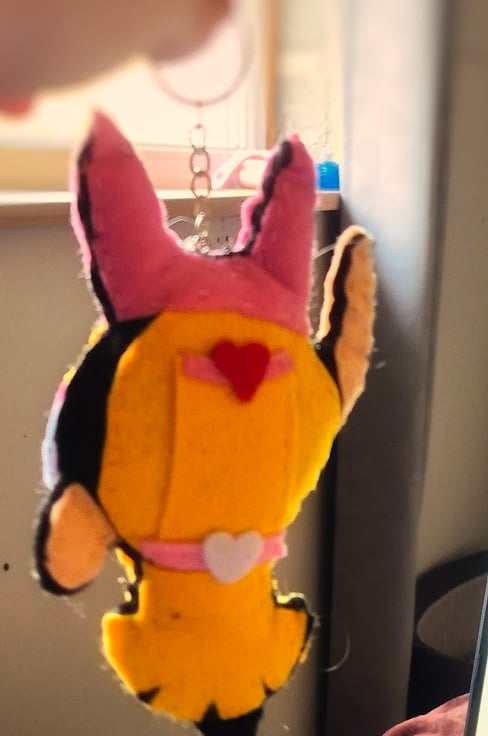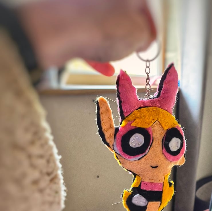 This handmade keyring features a felt character inspired by retro animated cartoons, carefully cut, layered, and stitched by hand. Made using bright felt colours and simple stitched details, the design has a playful, nostalgic look with a soft, lightweight finish.