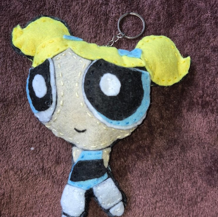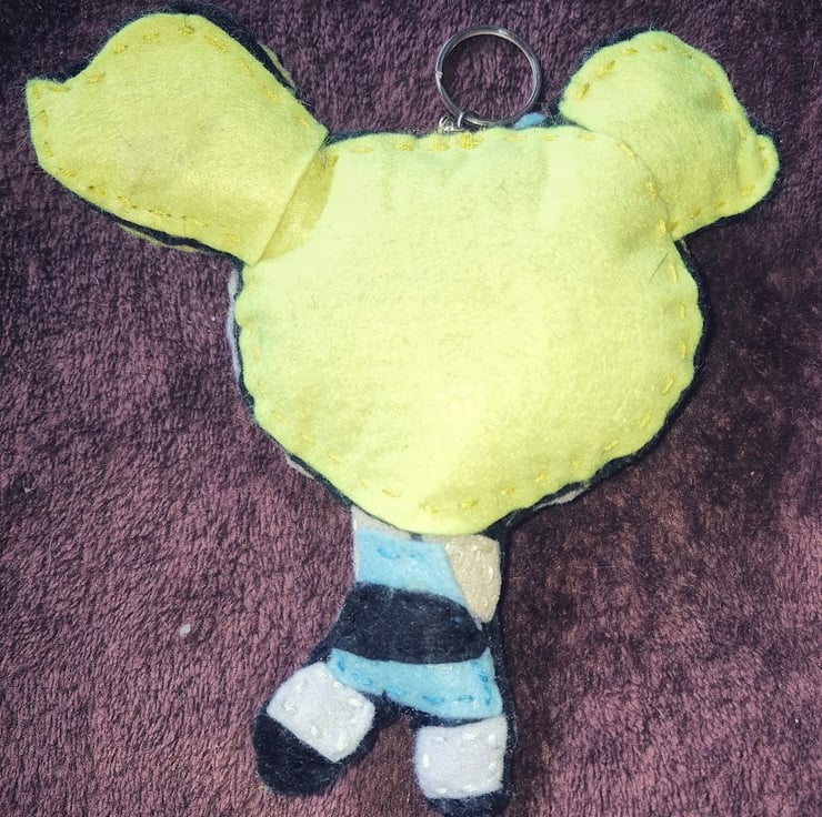 This handmade keyring features a felt character inspired by retro animated cartoons, carefully cut, layered, and stitched entirely by hand. Made using soft felt in pastel blue, yellow, black, and cream tones, the design has a sweet, nostalgic look with bold eyes and a classic cartoon silhouette.