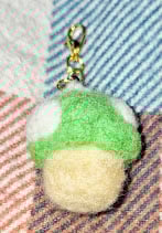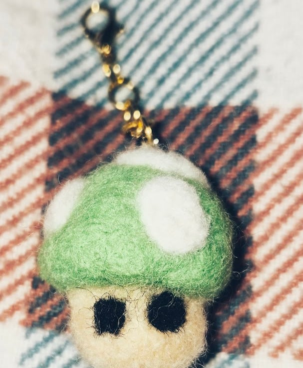 This handmade keyring features a needle felted mushroom inspired by retro video game imagery, carefully sculpted by hand using wool fibres. The mushroom is fully needle felted, giving it a soft, rounded shape with a tactile, slightly fluffy texture.