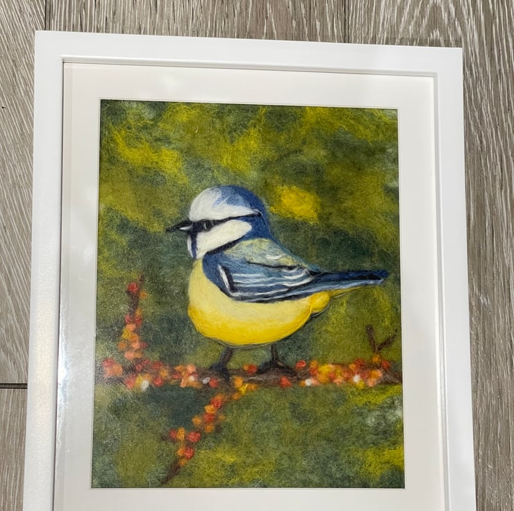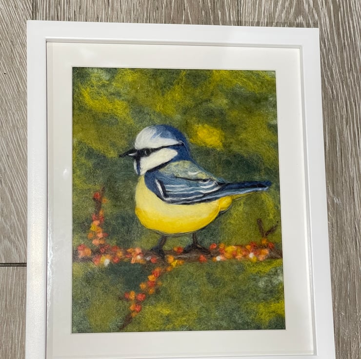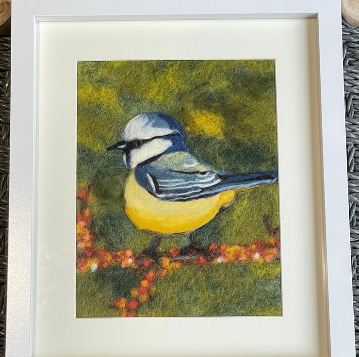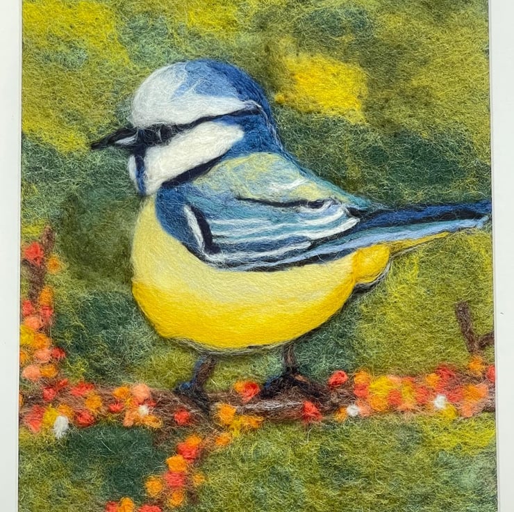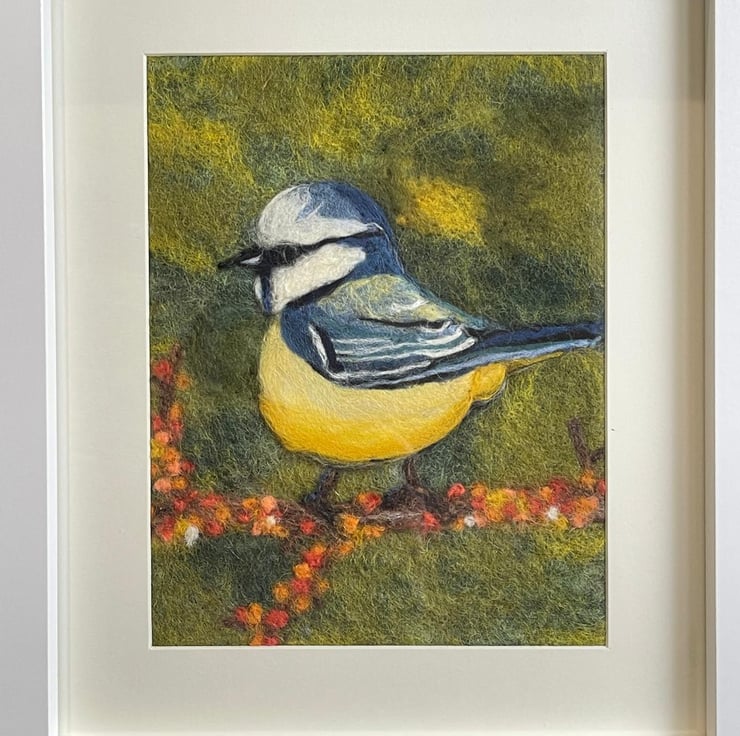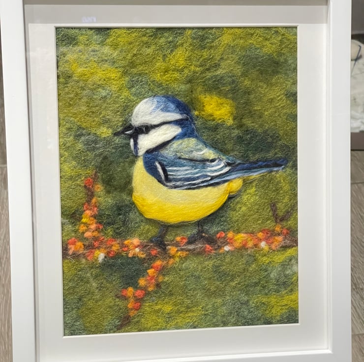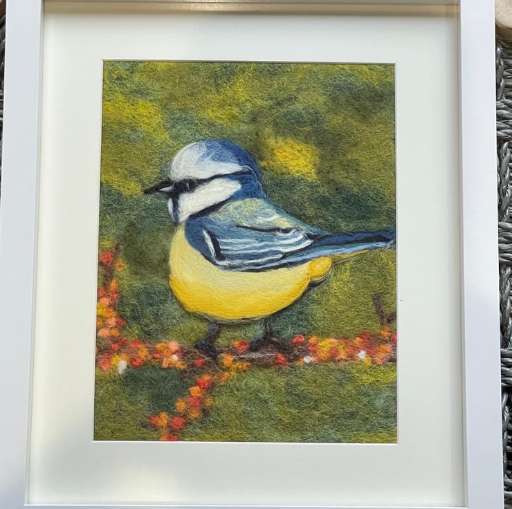 Blue tits have always felt like tiny sparks of happiness to me. They appear so suddenly in the garden, full of energy and curiosity, and I can never quite resist stopping to watch them. This felted painting was inspired by those small, joyful moments — a flash of blue and yellow, a pause on a branch, a quick glance in my direction.