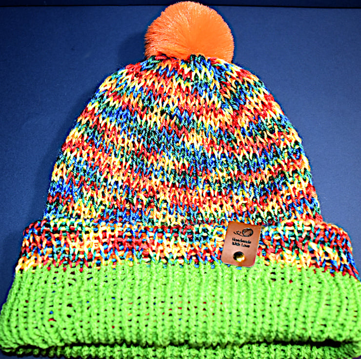 A bright multi coloured hat with an apple green rim, along with the orange faux fur pom pom.