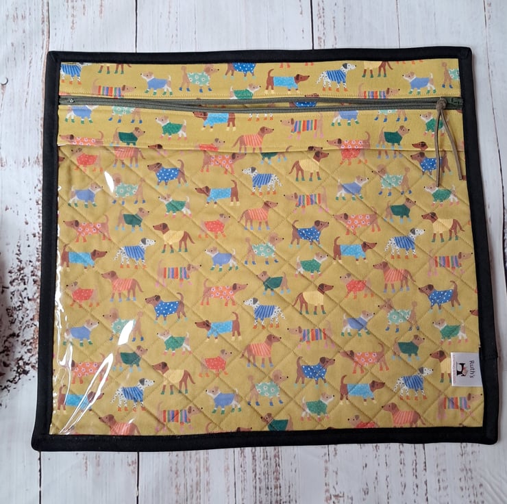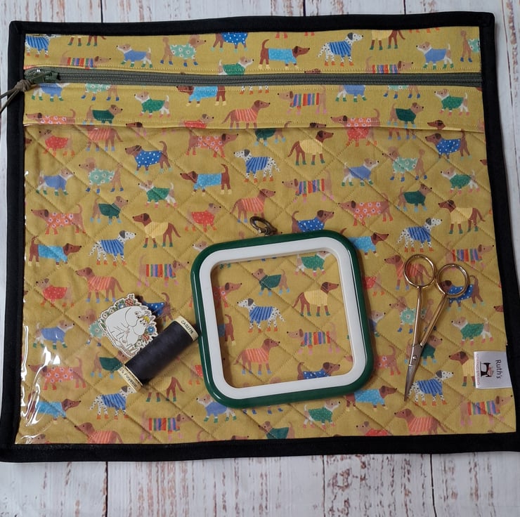 This cute project bag has a clear vinyl front so you can see what you're working on. The back is padded with wadding to provide structure and quilted. Perfect for keeping your embroidery safe and accessories grouped together.