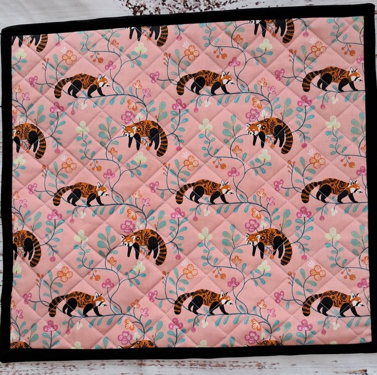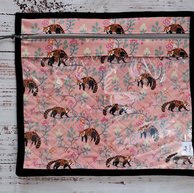 Materials: 100% cotton fabric, clear vinyl, synthetic wadding, nylon zip.