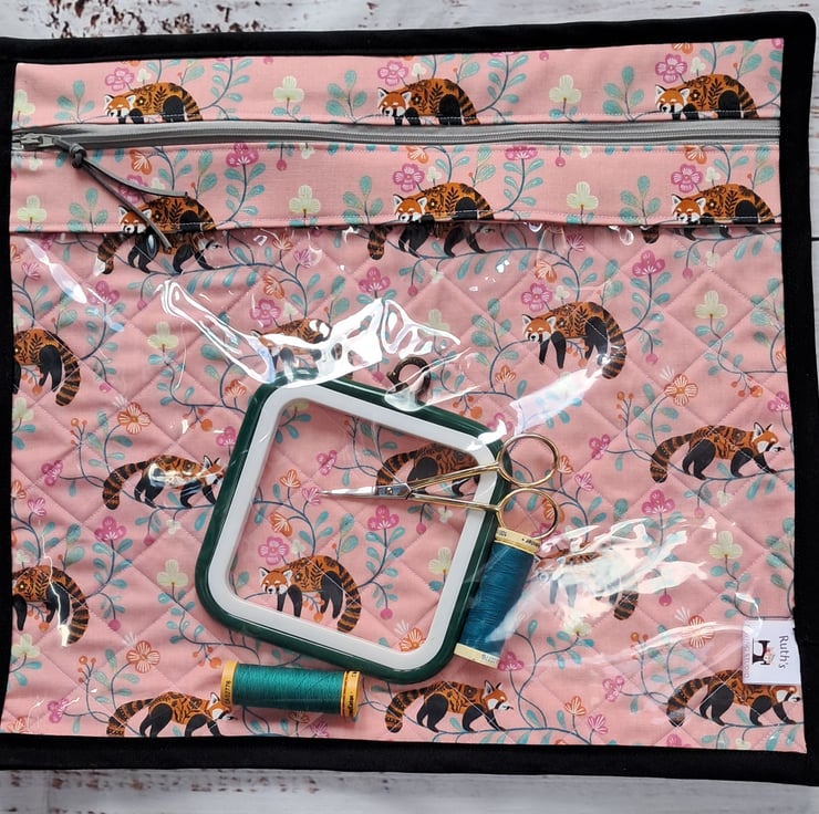 This cute project bag has a clear vinyl front so you can see what you're working on. The back is padded with wadding to provide structure and quilted. Perfect for keeping your embroidery safe and accessories grouped together.