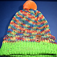 A grey coloured hat, along with the black faux rabbit fur pom pom.