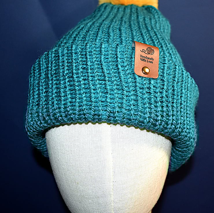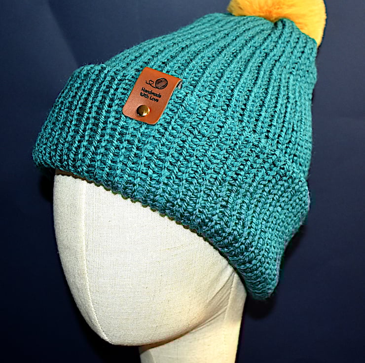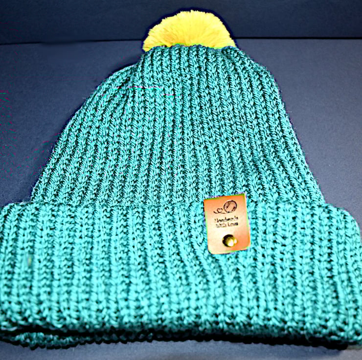 A bright sea green hat, along with the mustard faux fur pom pom.