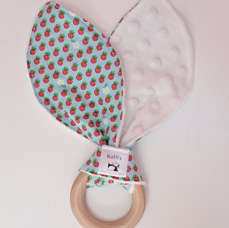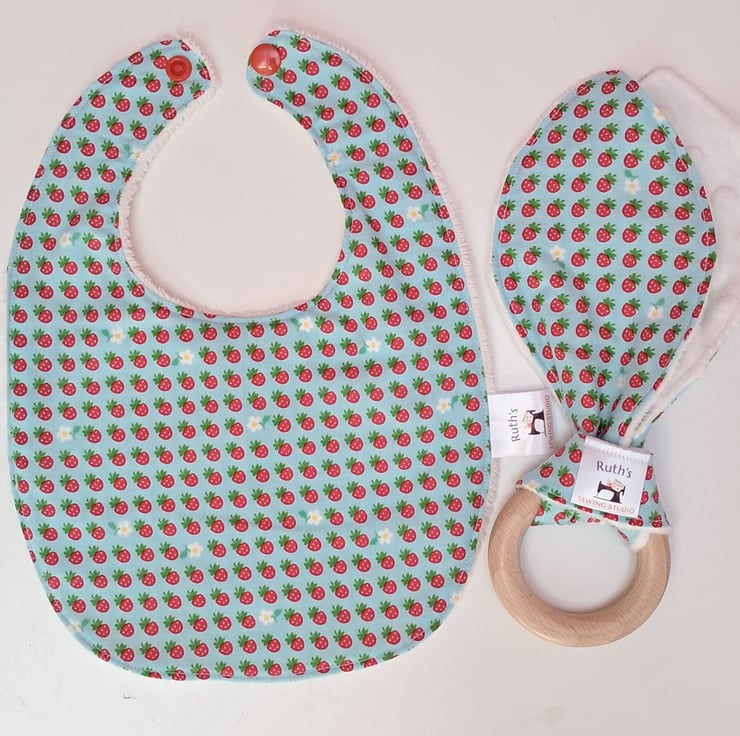 Materials: Bib and burping cloth: 100% cotton fabric, bamboo towelling backing Teething ring: 100% cotton fabric backed with minky fabric. High quality beech wood ring.