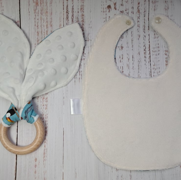 Materials: Bib and burping cloth: 100% cotton fabric, bamboo towelling backing Teething ring: 100% cotton fabric backed with minky fabric. High quality beech wood ring.