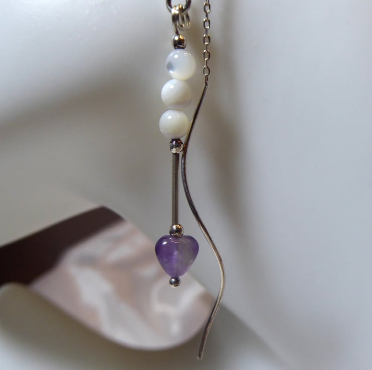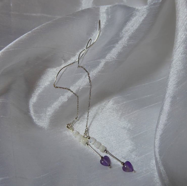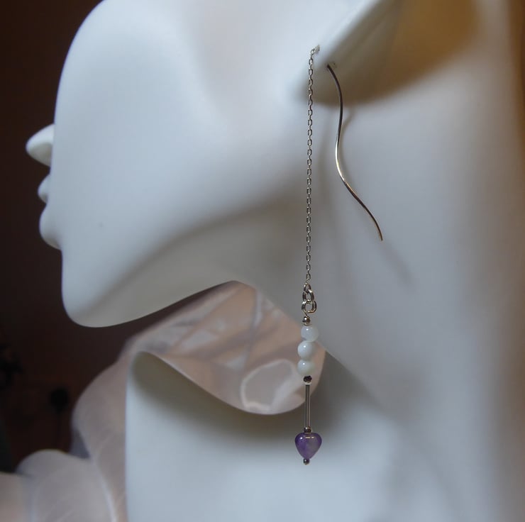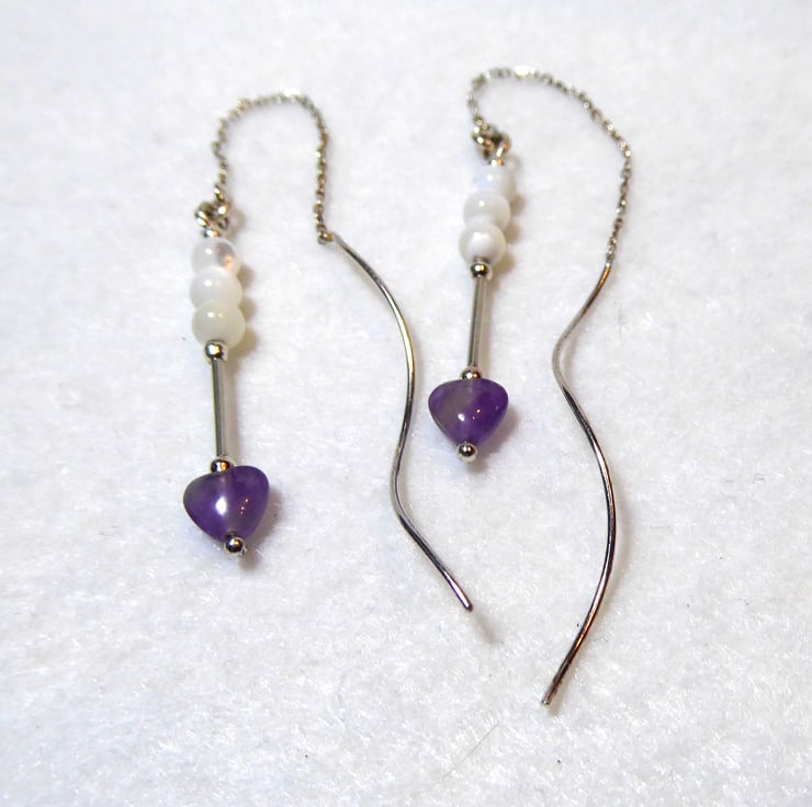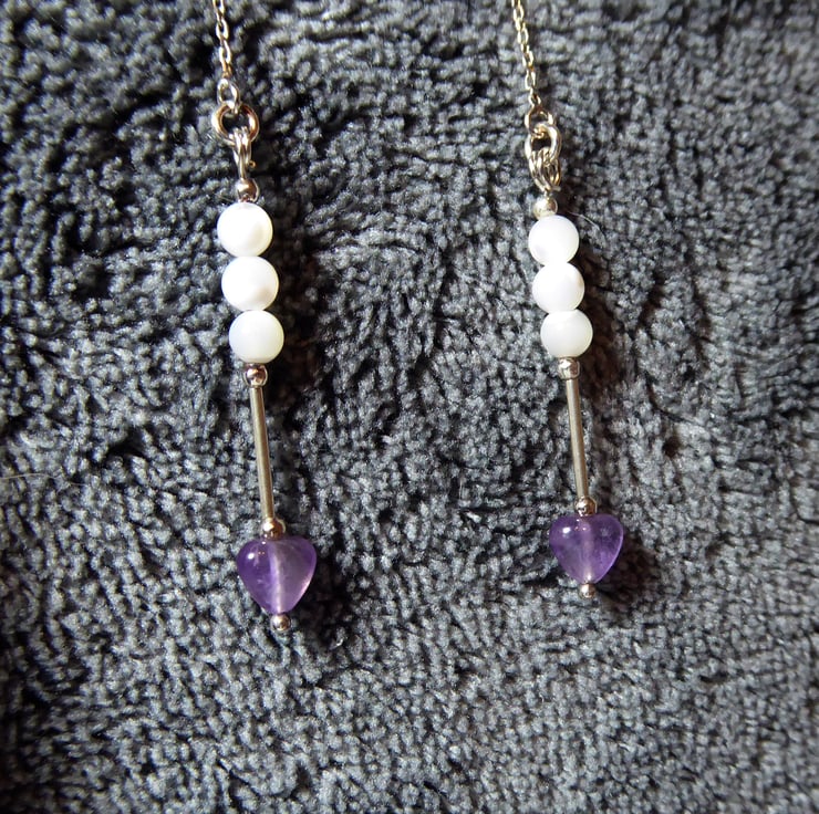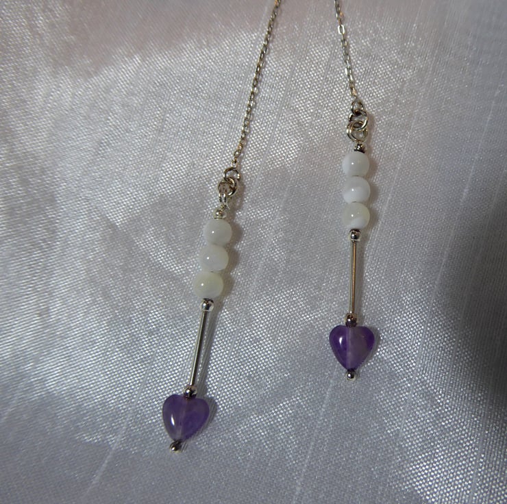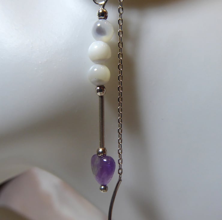 Sterling Silver Threader Earrings with Amethyst Heart & Mother of Pearl Beads
