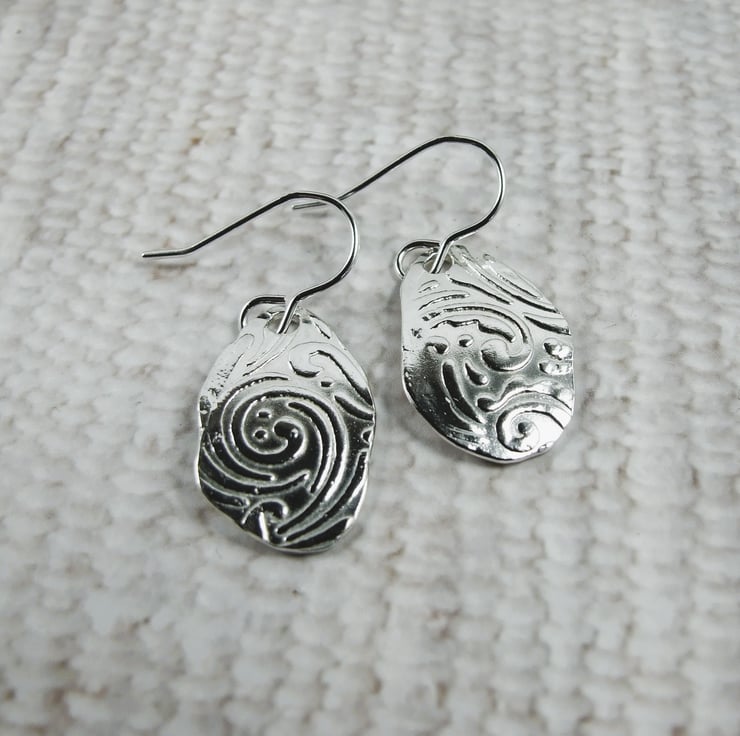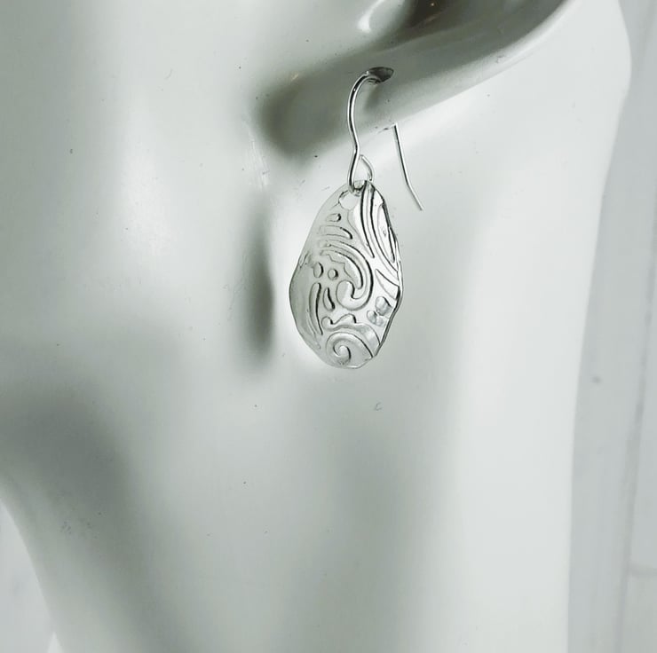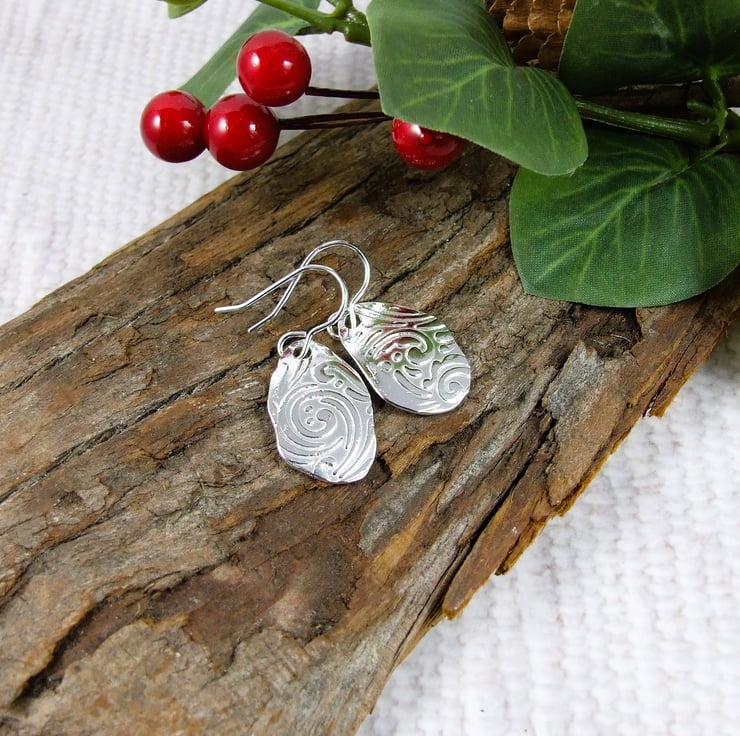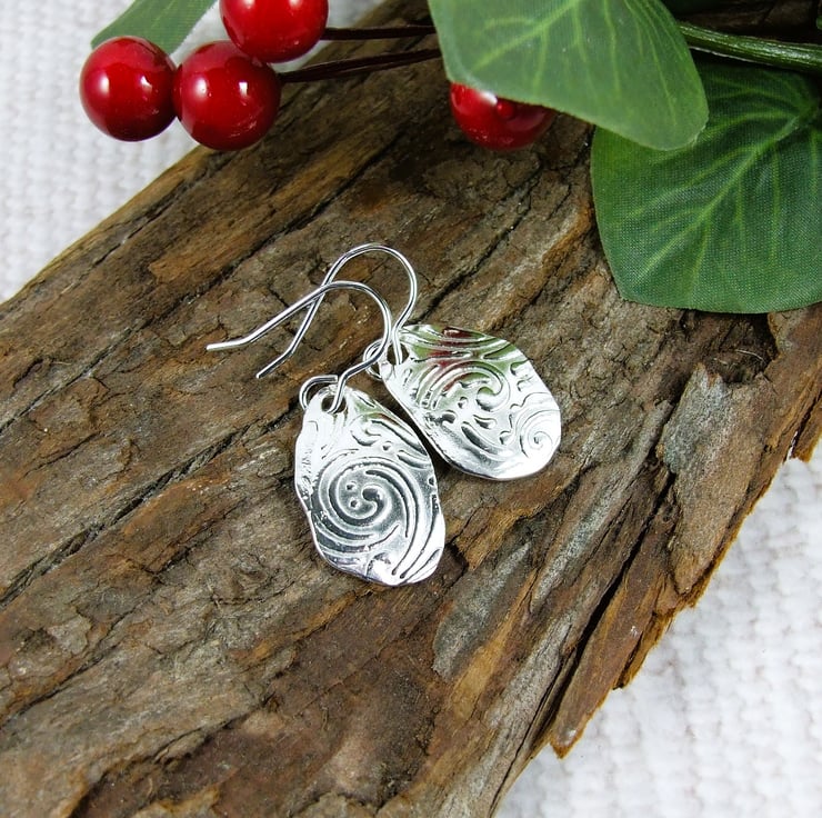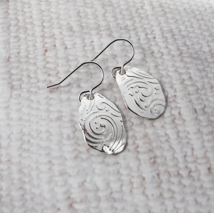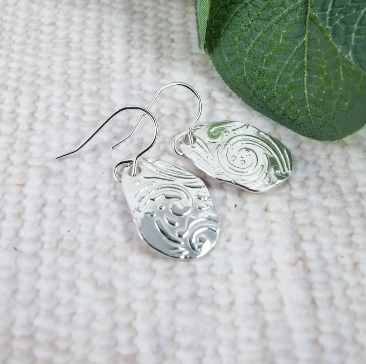 Silver Earrings, leaf pattern droppers freeform forged shape embossed with swirled leaf pattern.