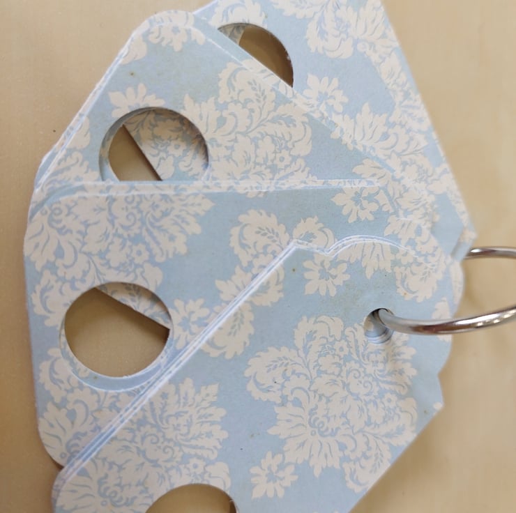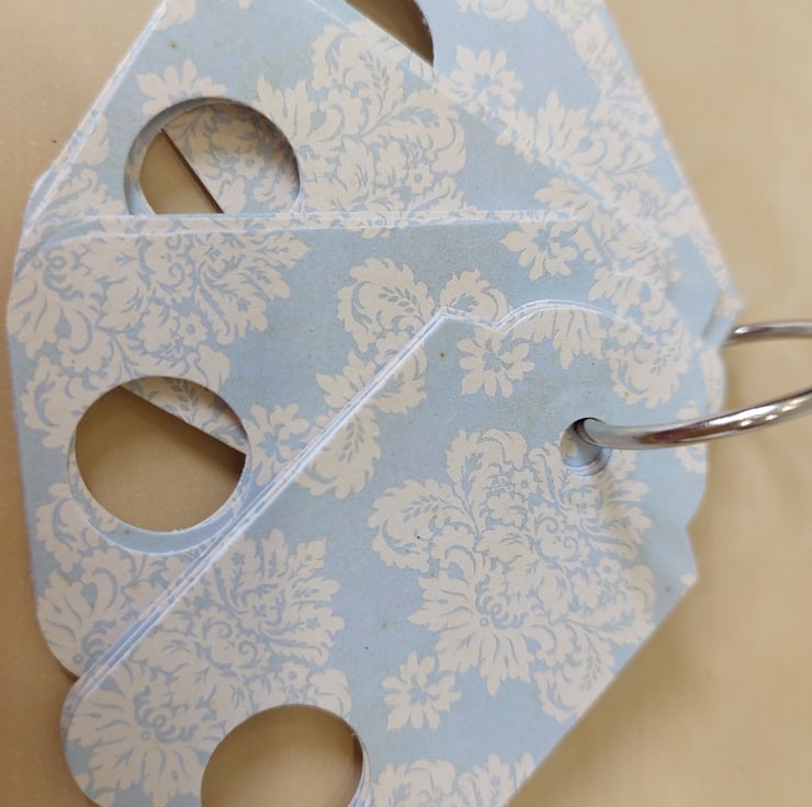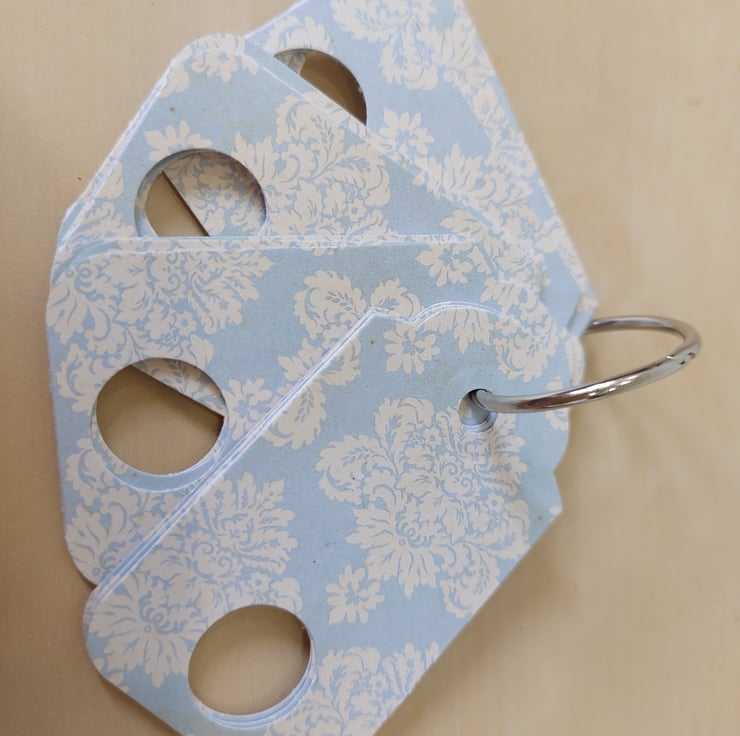 Set of 16 embroidery floss drop organisers. Hand punced from strong 350 gsm card. Secured with a metal ring. Ideal for keeping your current project threads together without becoming tangled. Portable and great for on the go.