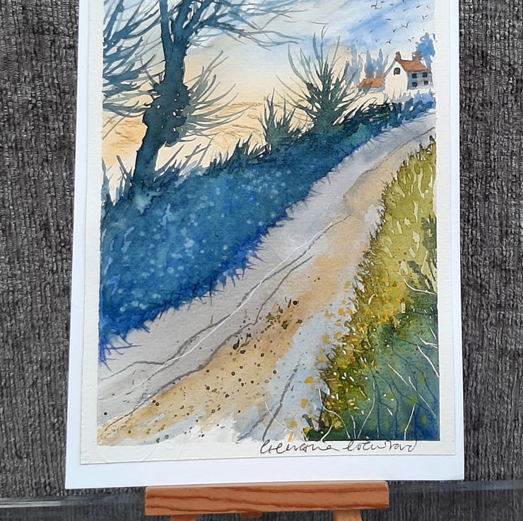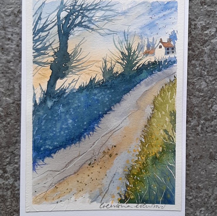 Painted on watercolour paper and mounted onto quality, white card stock, which has a slight texture. The painting is protected by two coats of satin varnish.