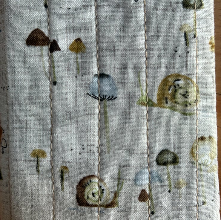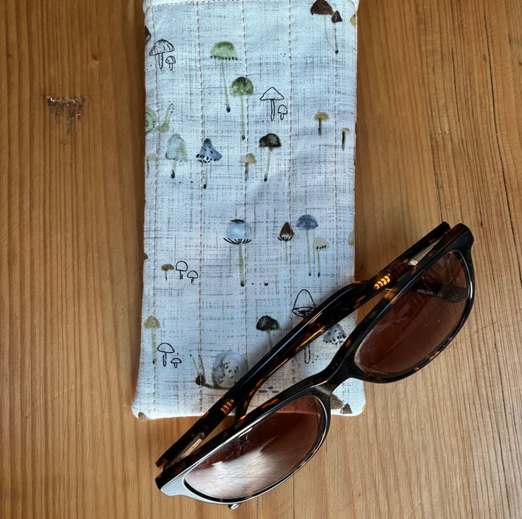 The padded slip in style glasses/sunglasses case is made in this lovely snails and mushrooms print fabric on a beige linen look background.