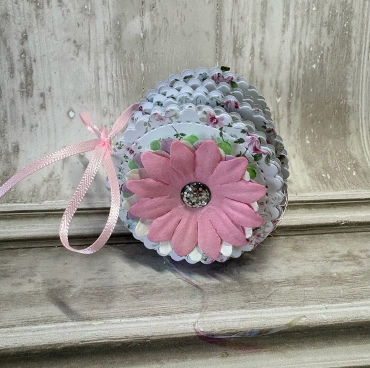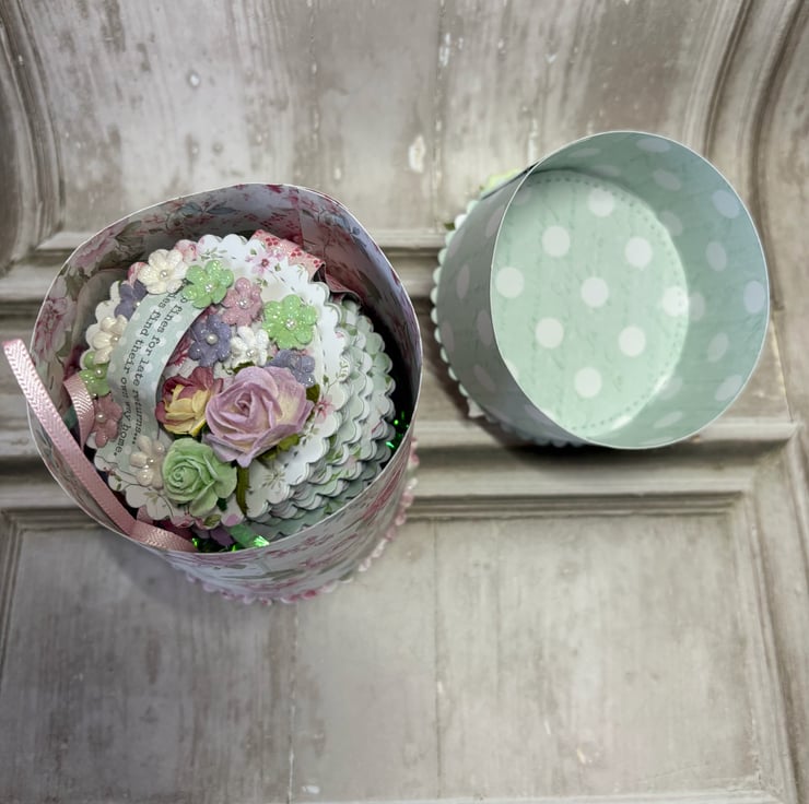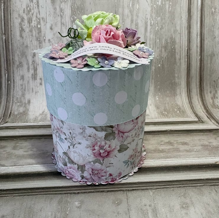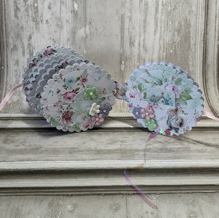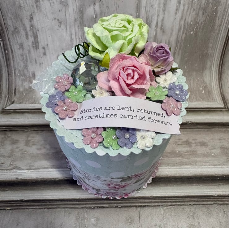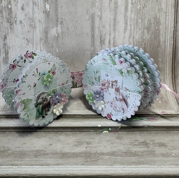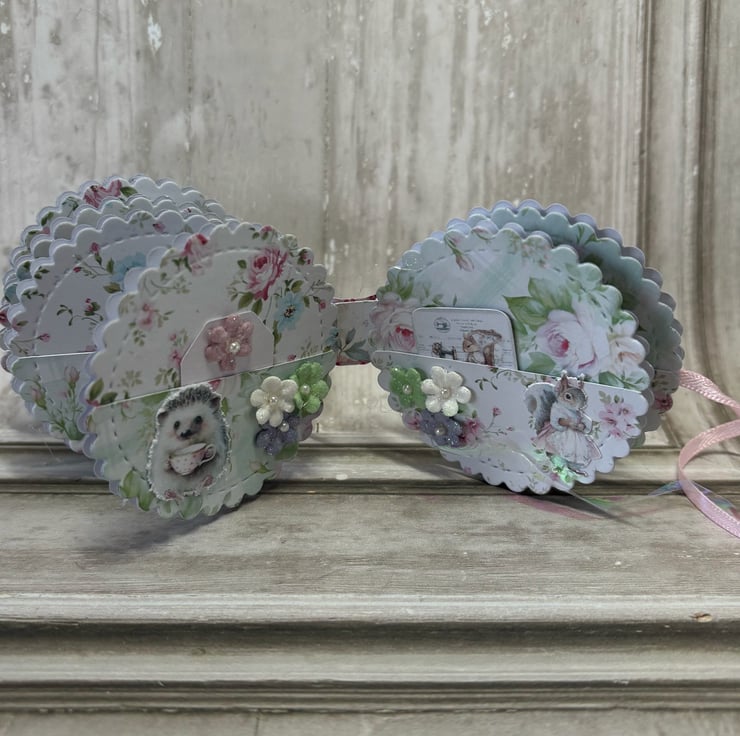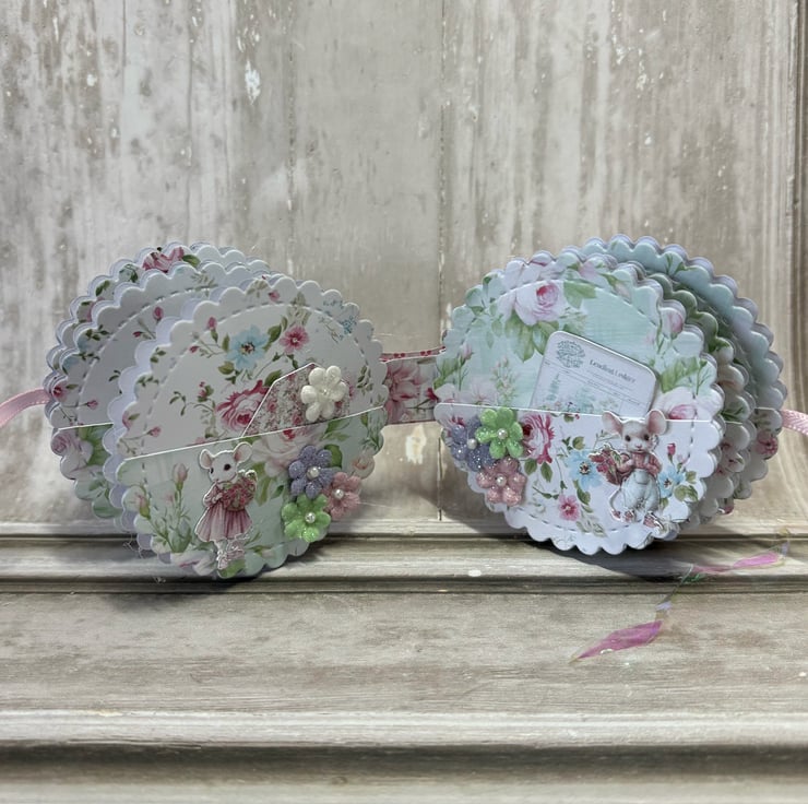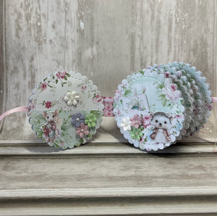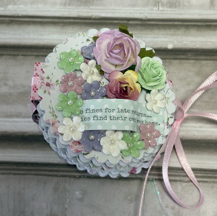 A pretty box, handmade in delightful print of roses and other flowers, polka dot lid. The top of the lid is embellished with mini glitter flowers, roses, diamante and the wording 'Stories are lent, returned and sometimes carried forever'. Open the box to reveal a mini booklet 10 pages with pockets and a tiny fussy cut image of an animal from Hedgerow Hollow. The cover is covered with roses and glitter flowers with the wording ' No fines for late returns... Stories find their own way home'. Tied with pink ribbon, opens to reveal pages with pockets. Holding either a mini tag or story card. Tiny fussy cut creatures to embellished and mini glitter flowers. The back of there booklet has a pretty 4 coloured petal paper flower with a glitter centre.