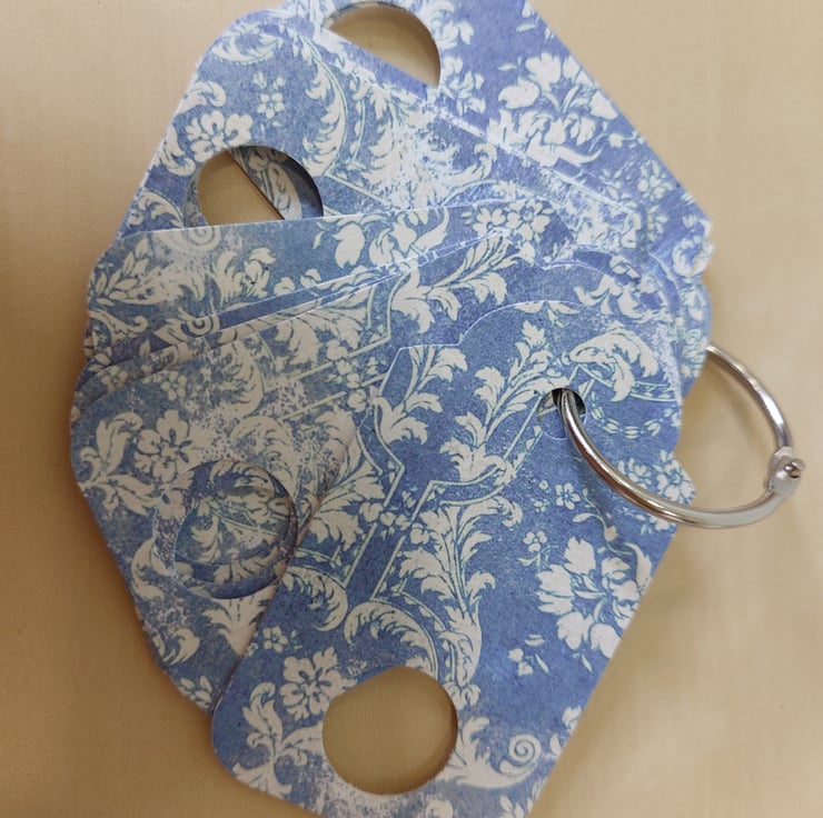 Set of 16 embroidery floss drop organisers. Hand punced from strong 350 gsm card. Secured with a metal ring. Ideal for keeping your current project threads together without becoming tangled. Portable and great for on the go.
