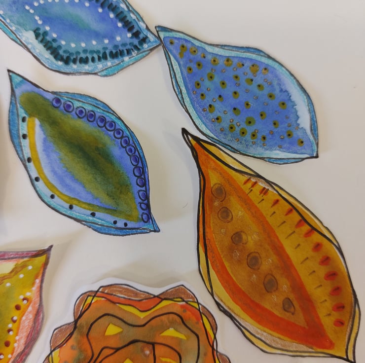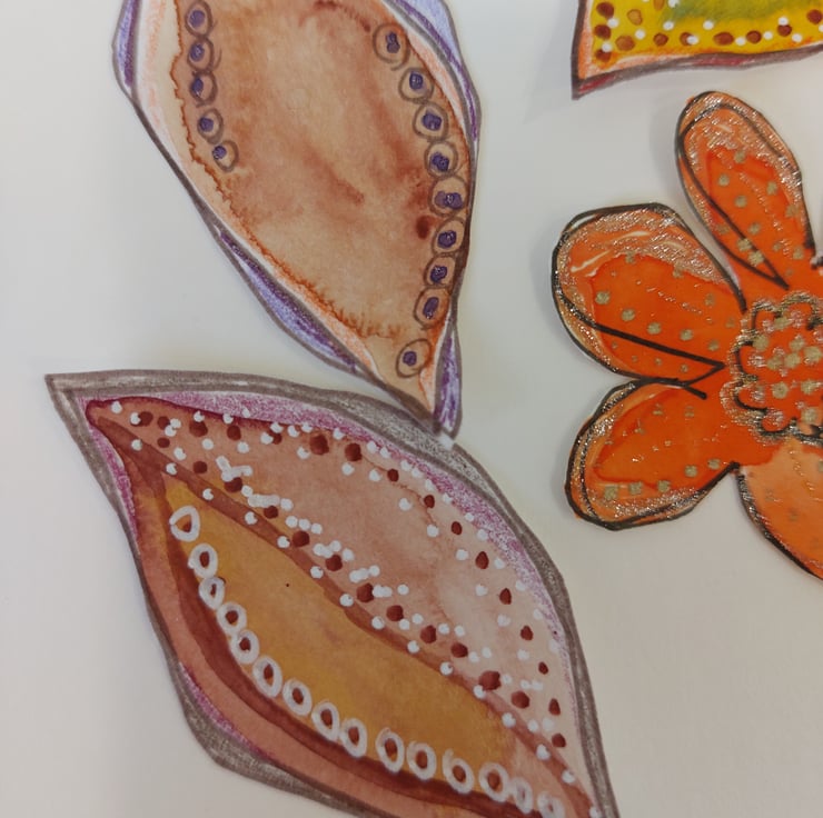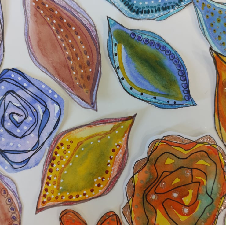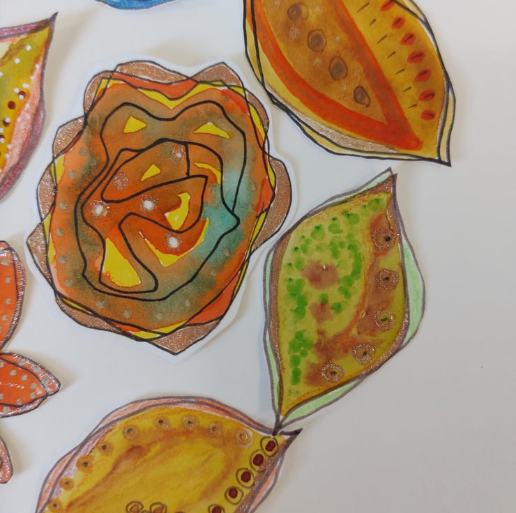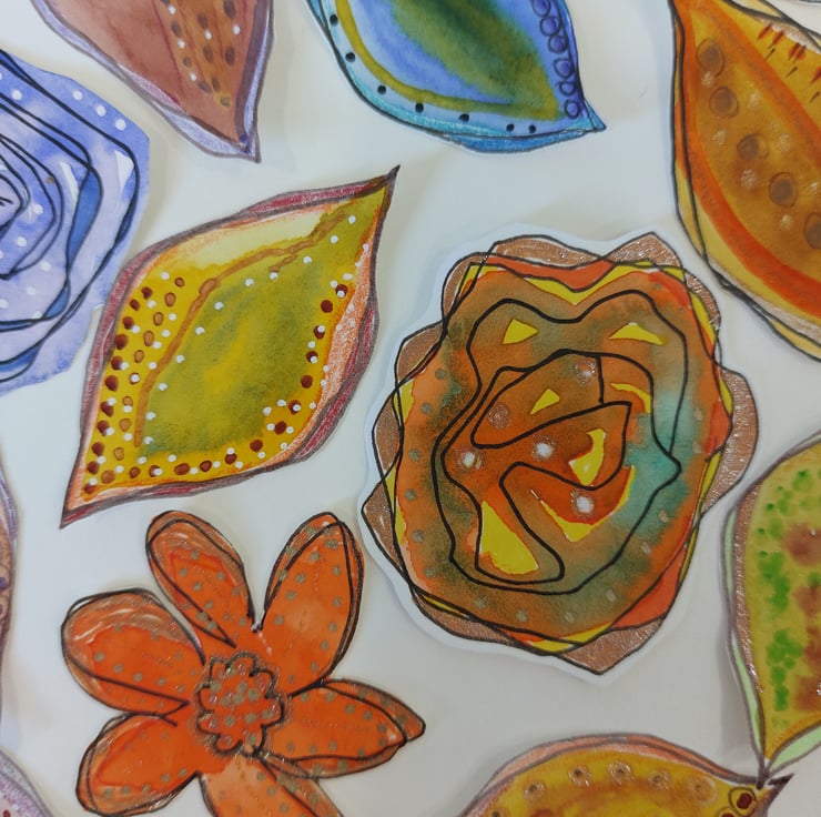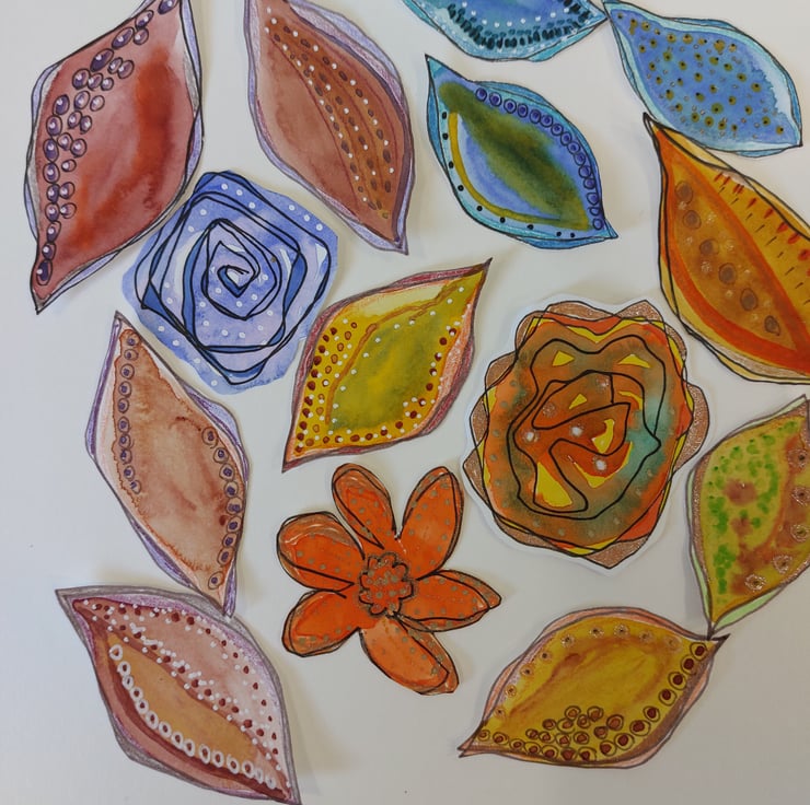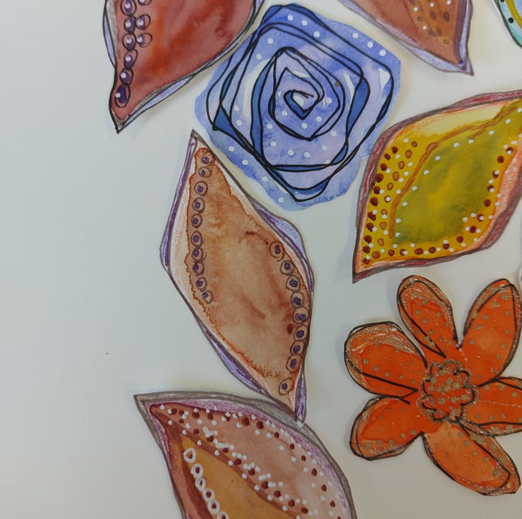 Set of 14 mixed media abstract flowers and leaves. Hand painted in water colour and gouache on quality 160 gsm cartridge paper. Detailed with coloured pencil and markers