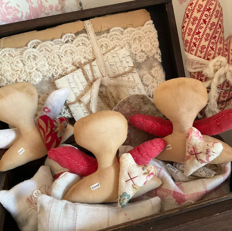 Primitive style angel consisting of a tea stained body section (head and shoulders), vintage quilt wings and a vintage fabric heart, attached with a cross stitch.
