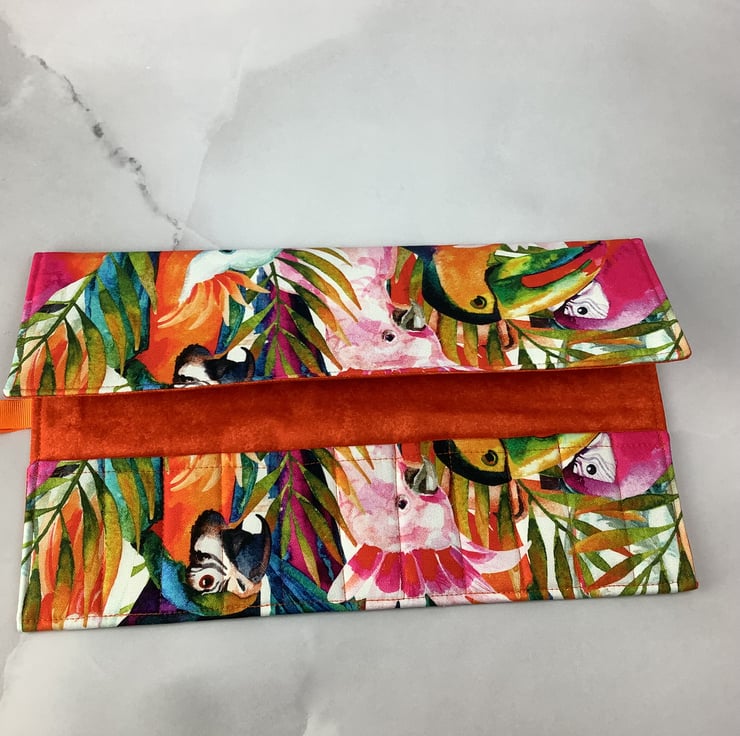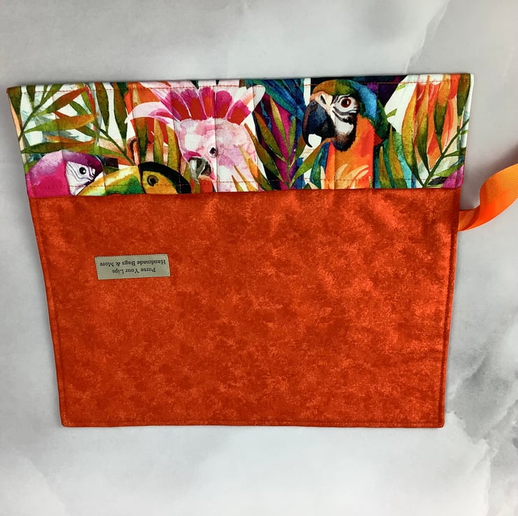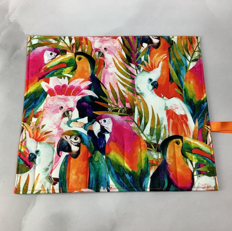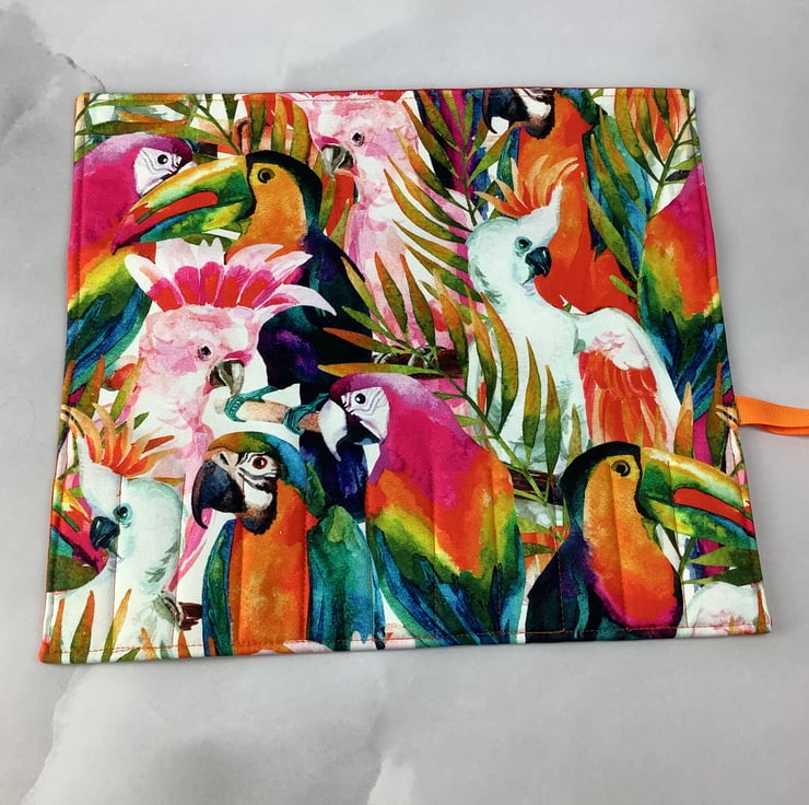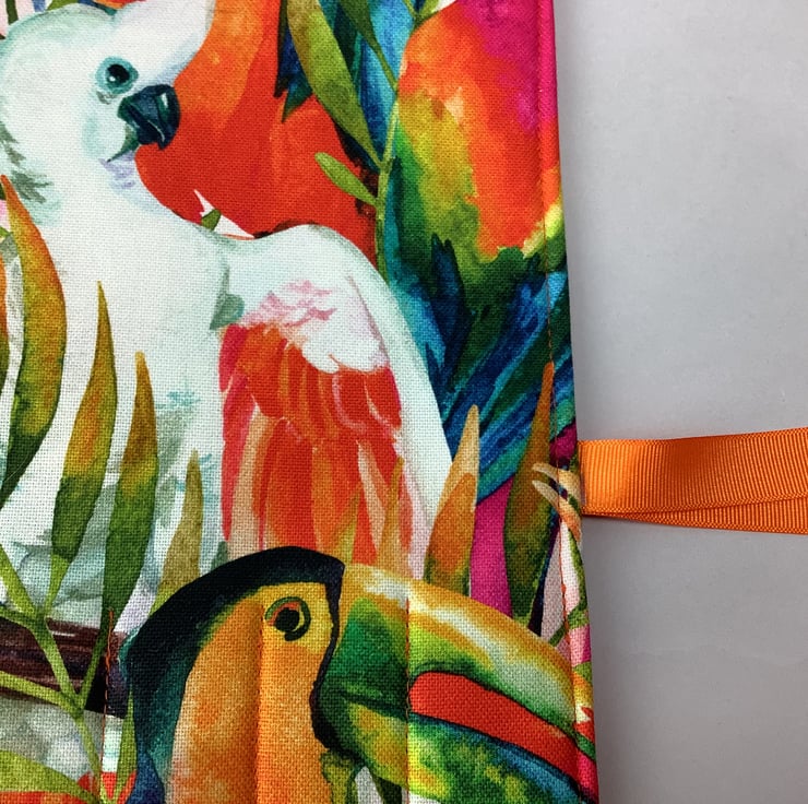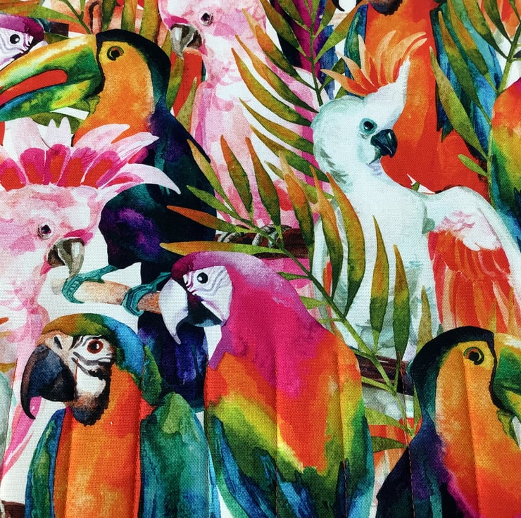 Handmade fabric wrap in a fun tropical j7ngle birds themed heavy cotton fabric.