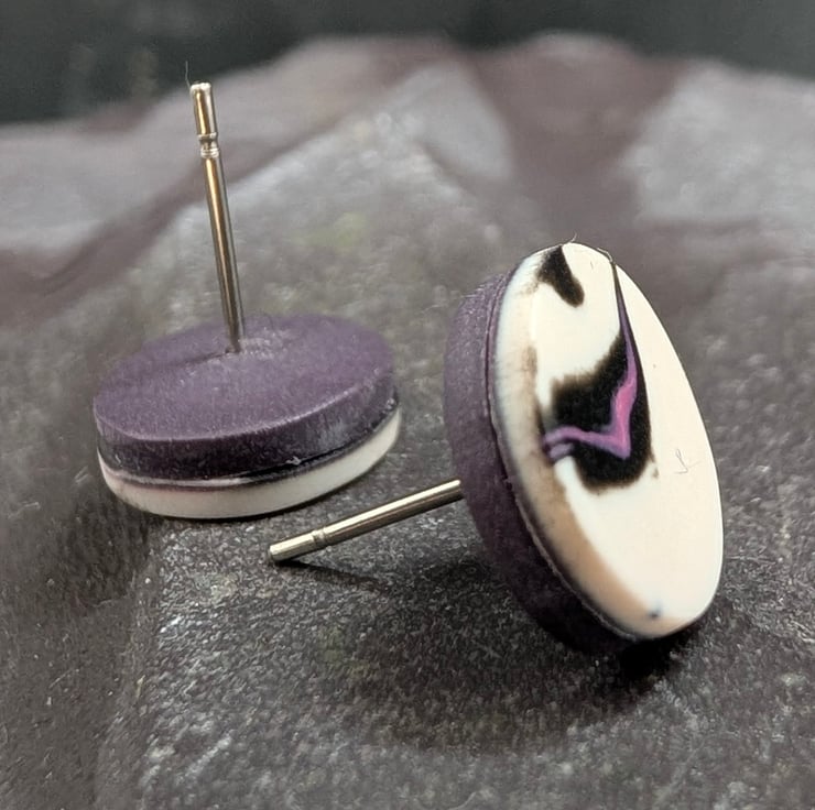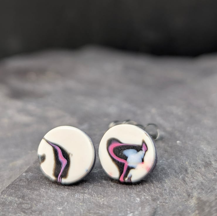 Each pair is individually crafted with high quality polymer clay, ensuring no two earrings are exactly alike. Featuring a palette of light rose pink, deep pink, crisp white, and bold black, the abstract swirls look timeless and modern. These are backed with a deep purple tone which gives a pop of contrast colour when worn.