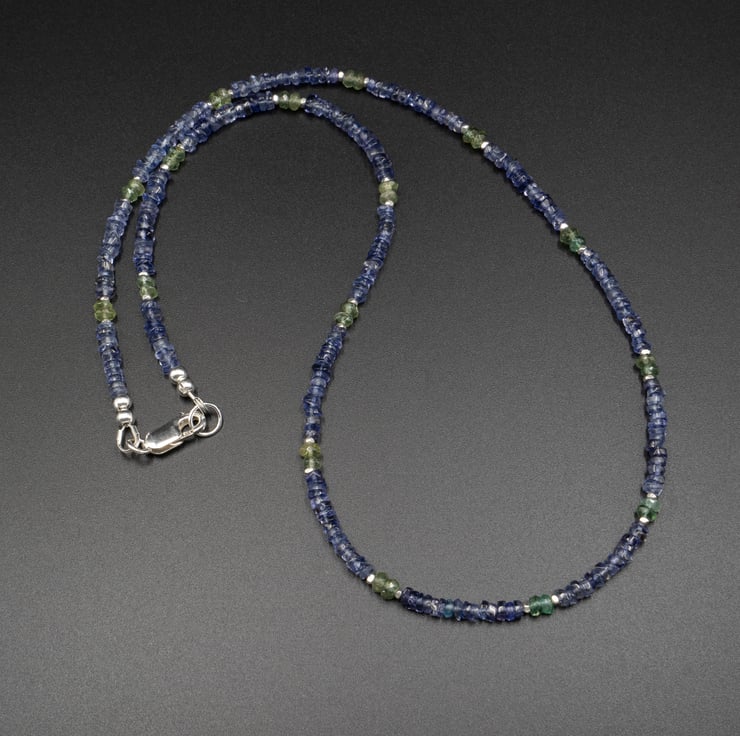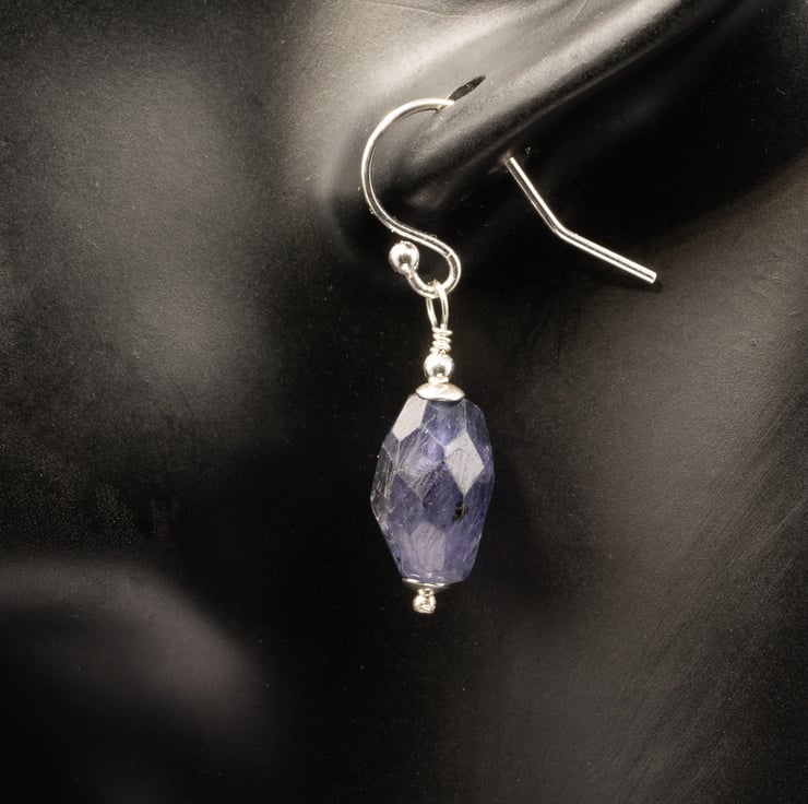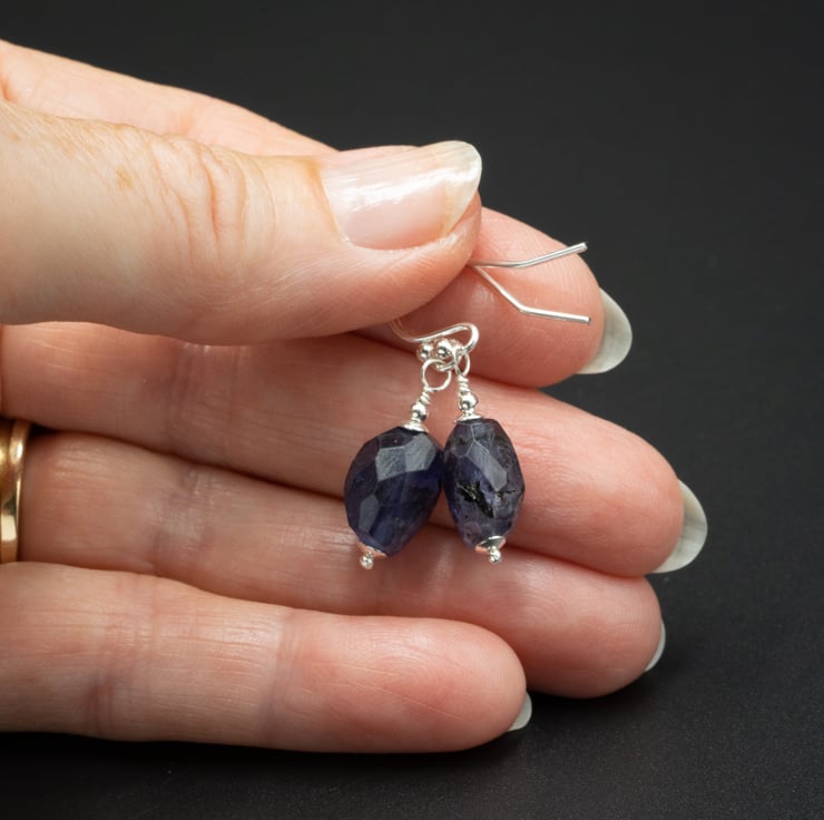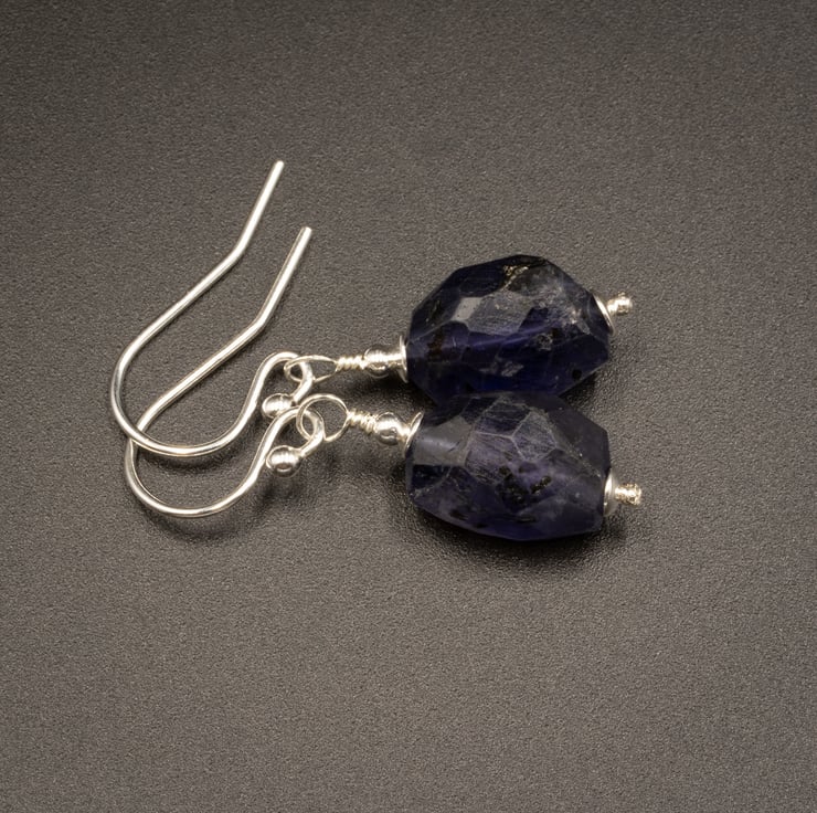 Dusky blue iolite also known as water sapphire. Faceted 12 x 9mm beads are topped and tailed with sterling silver bead caps and beads.