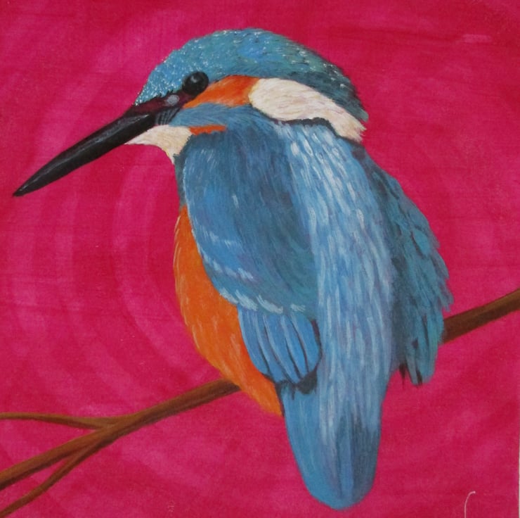 An A5 printed reproduction greetings card of an original acrylic painting of a Kingfisher with a cerise pink background.