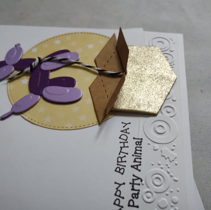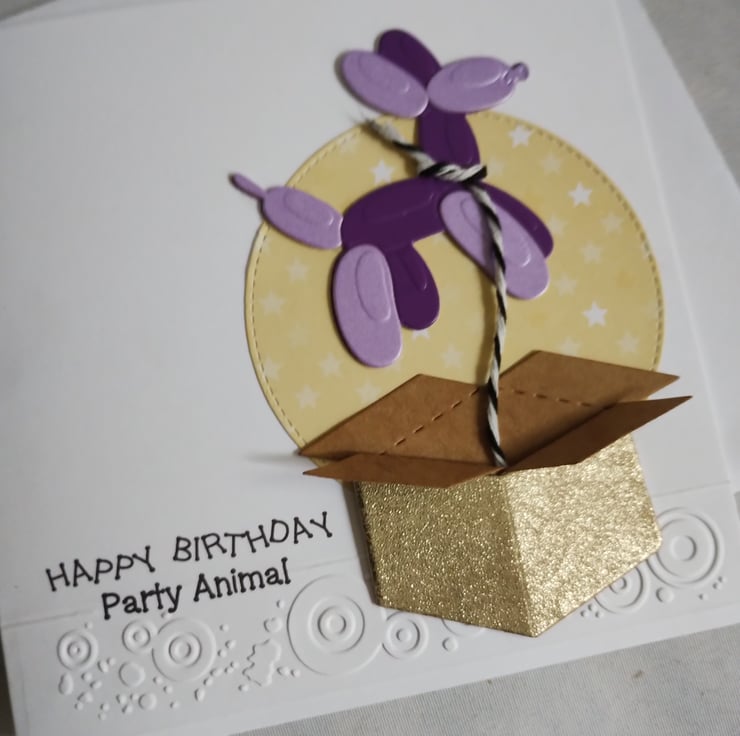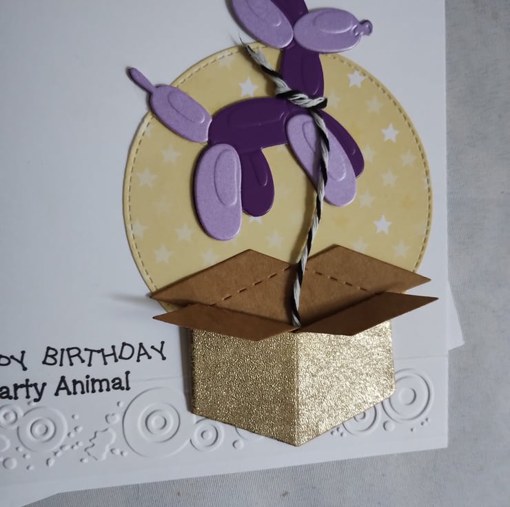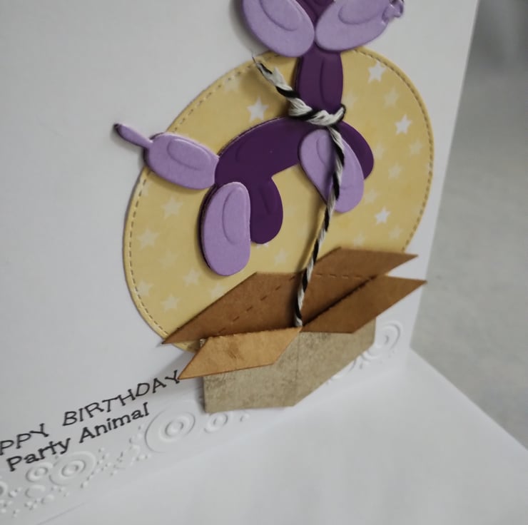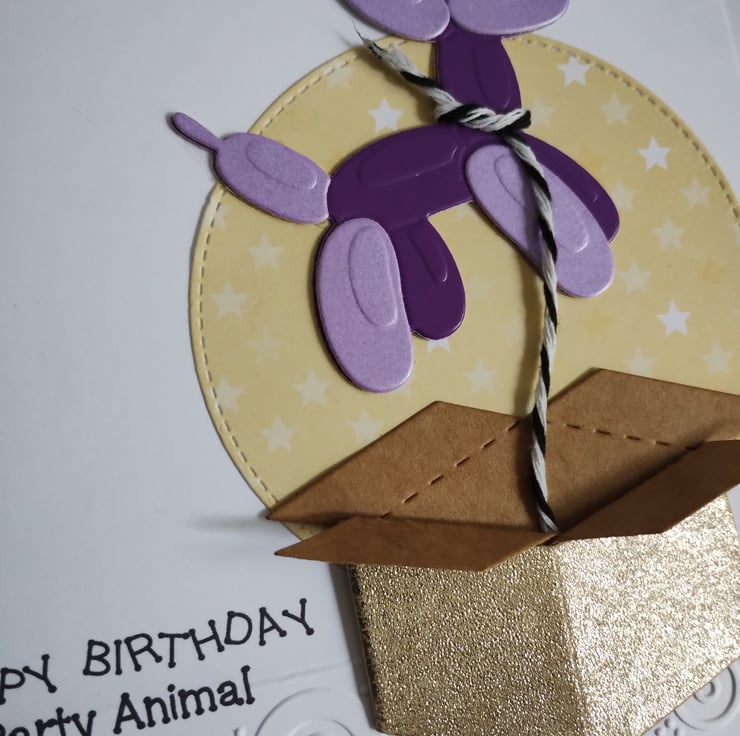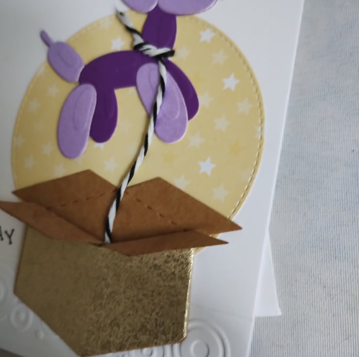 I've cut the box from kraft cardstock and golden card, the balloon dog is cut from premium purple and lilac cardstock which embosses the details beautifully. I've added a black and white baker's twine string to hold the balloon from floating away. There is a stitched circle background cut from yellow star patterned paper and I've embossed a line of quirky circles along the bottom to give a little added texture.