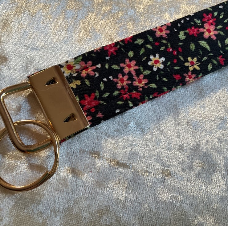 HOMEMADE WRISTLET KEY HOLDER - this one is in a pretty floral and black background colour way.