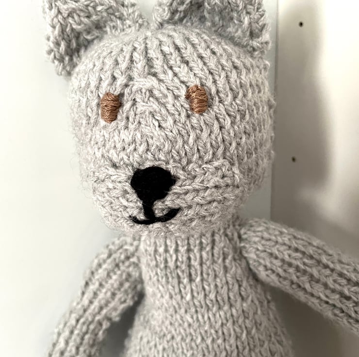 The muzzle is knitted grey double knitting wool with mouth and nose details in black embroidery silk.