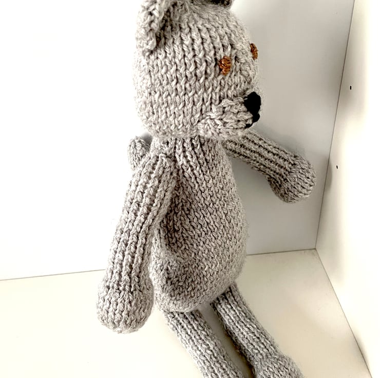 Cat is hand knitted from grey double knitting wool and is filled with soft toy filling which complies to BS1425, BS5852 and EN71 standards. The eyes are hand embroidered with brown embroidery silk.