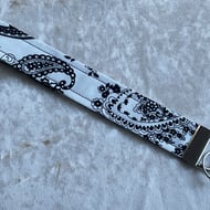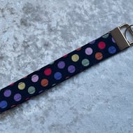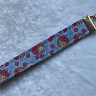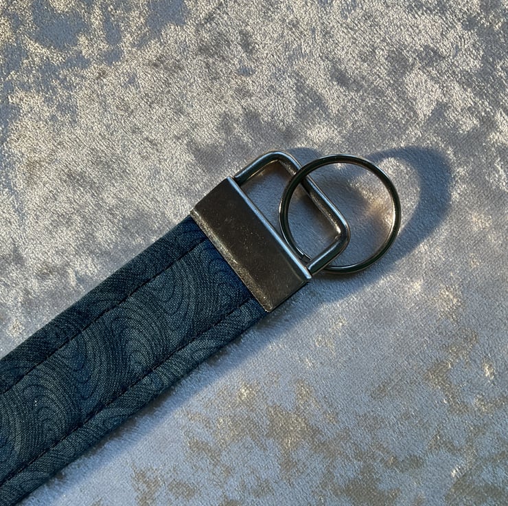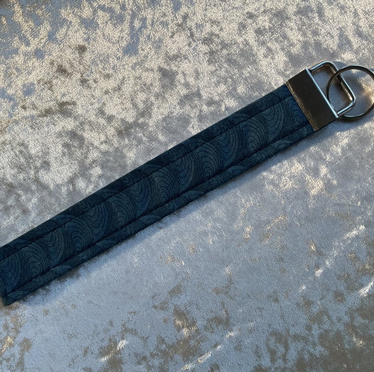 HOMEMADE WRISTLET KEY HOLDER - this one is in a dark blue design colour way. Pattern placement may vary.