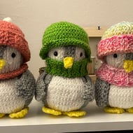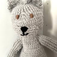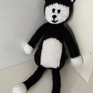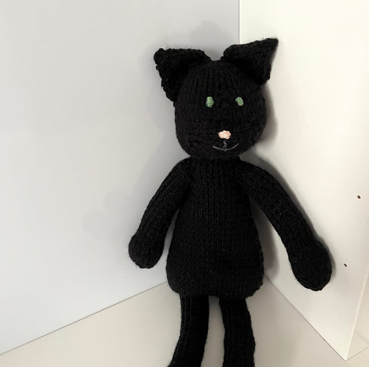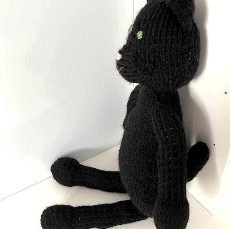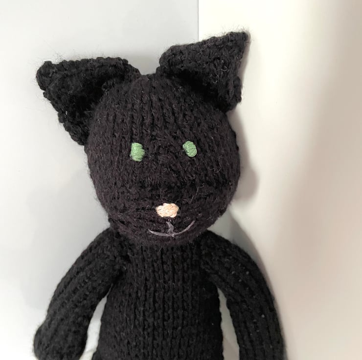 Cat is hand knitted from black double knitting wool and is filled with soft toy filling which complies to BS1425, BS5852 and EN71 standards. The eyes are hand embroidered with green embroidery silk and a light pink nose in embroidery silk.
