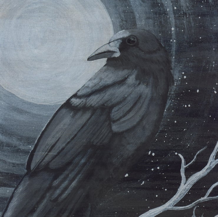 An A5 printed reproduction greetings card of an original acrylic painting of a crow in the moonlight.