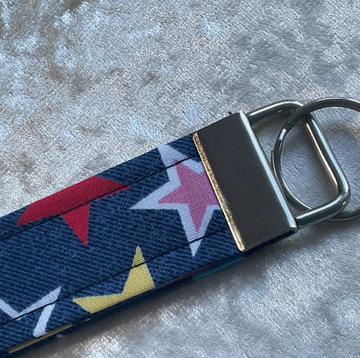 HOMEMADE WRISTLET KEY HOLDER - this one is in a star design and multi/navy colour way. Pattern placement will vary of course.