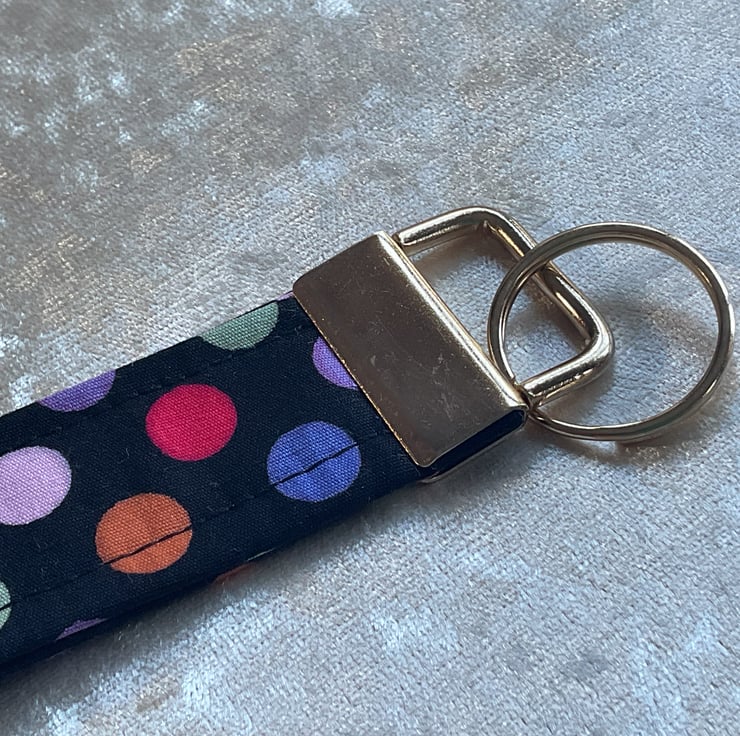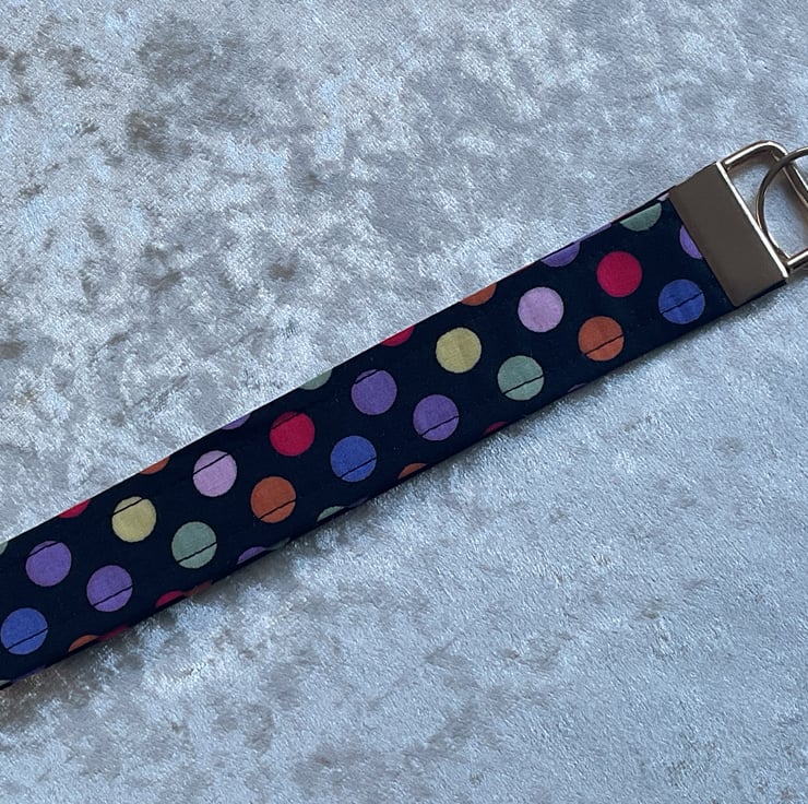 HOMEMADE WRISTLET KEY HOLDER - this one is in a dotty design and black colour way. Pattern placement will vary of course.