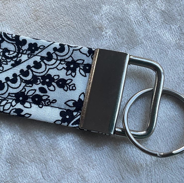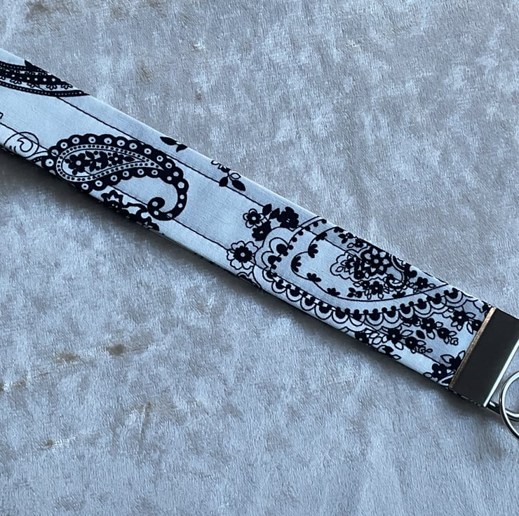 HOMEMADE WRISTLET KEY HOLDER - this one is in a paisley design in a white & black colour way. Pattern placement will vary of course.