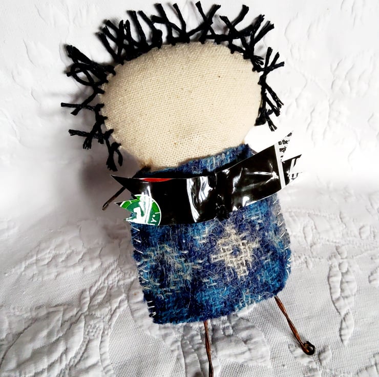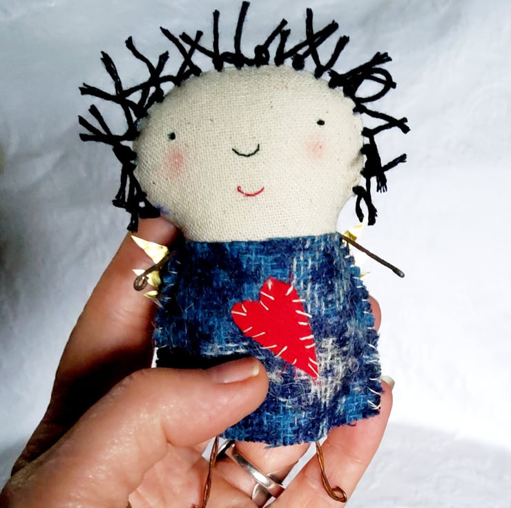 Little Angel of Love Is made from Osnaburg fabric with embroidery thread hair and embroidered features. Her dress is made from Yorkshire tweed ,hand stitched with a red cotton poplin heart.