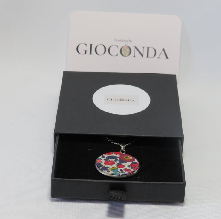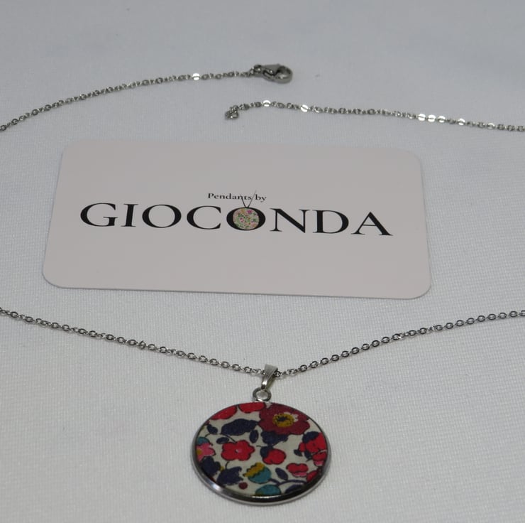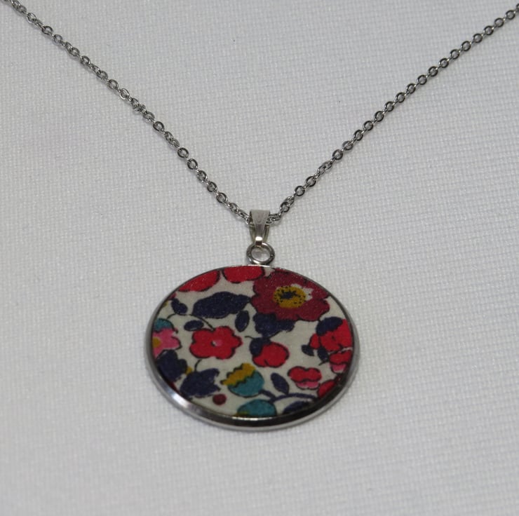 Pendant Necklace is made using quality Liberty Fabric, which is set in a 25mm Stainless Steel Bezel and hangs on a 45cm Stainless Steel Chain and fastening.