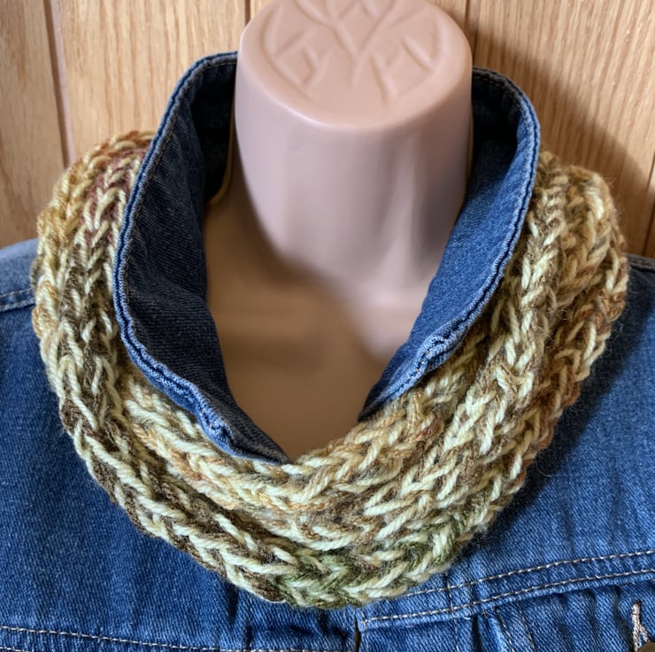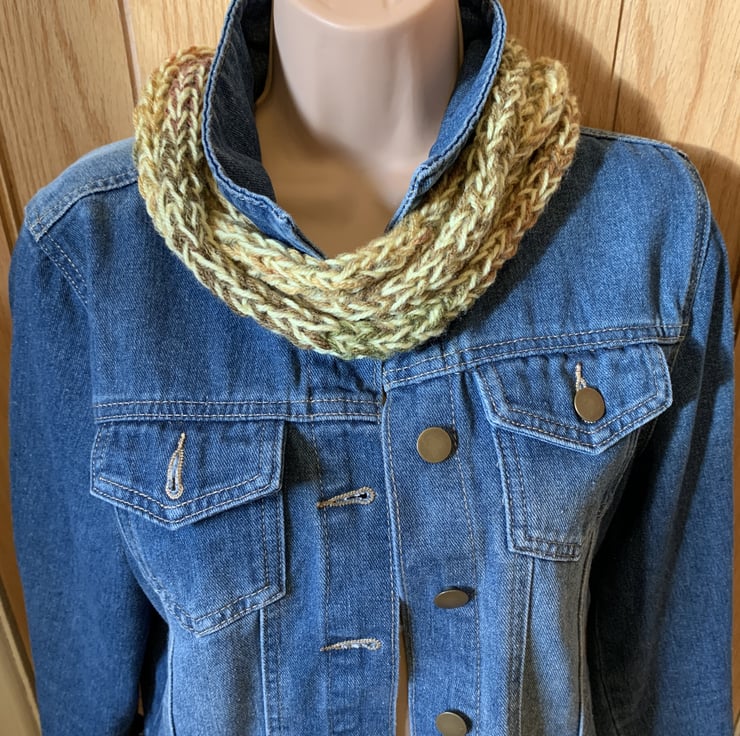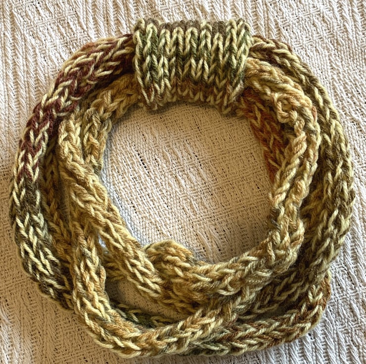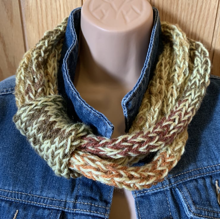 Handmade knitted loop scarf made with acrylic yarn and autumnal shades of brown and green with a touch of yellow.