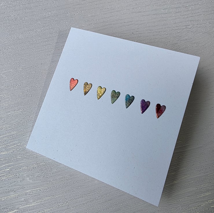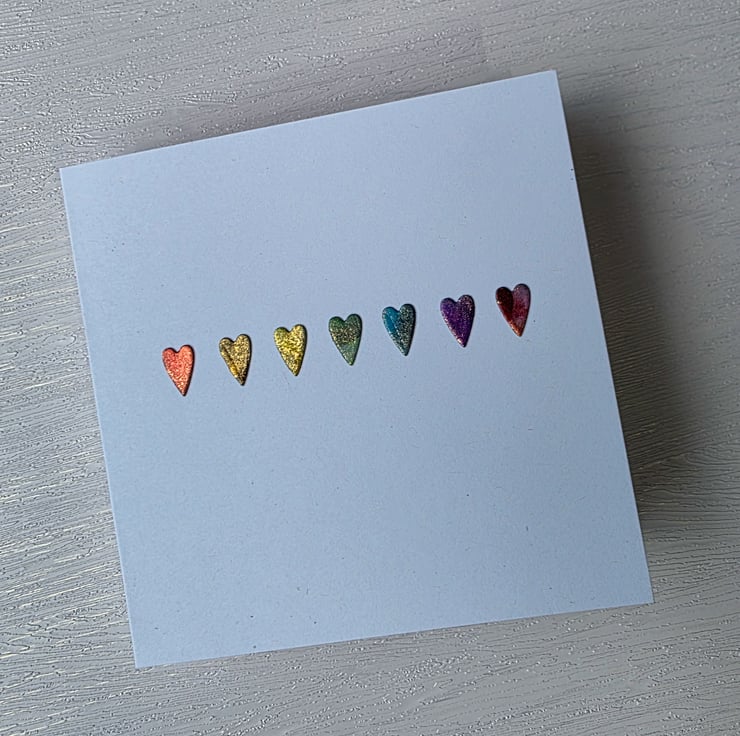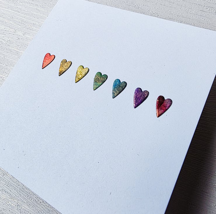 This card features a row of hearts die cut from an original alcohol ink painting, in rainbow hues and with a touch of metallic gold.