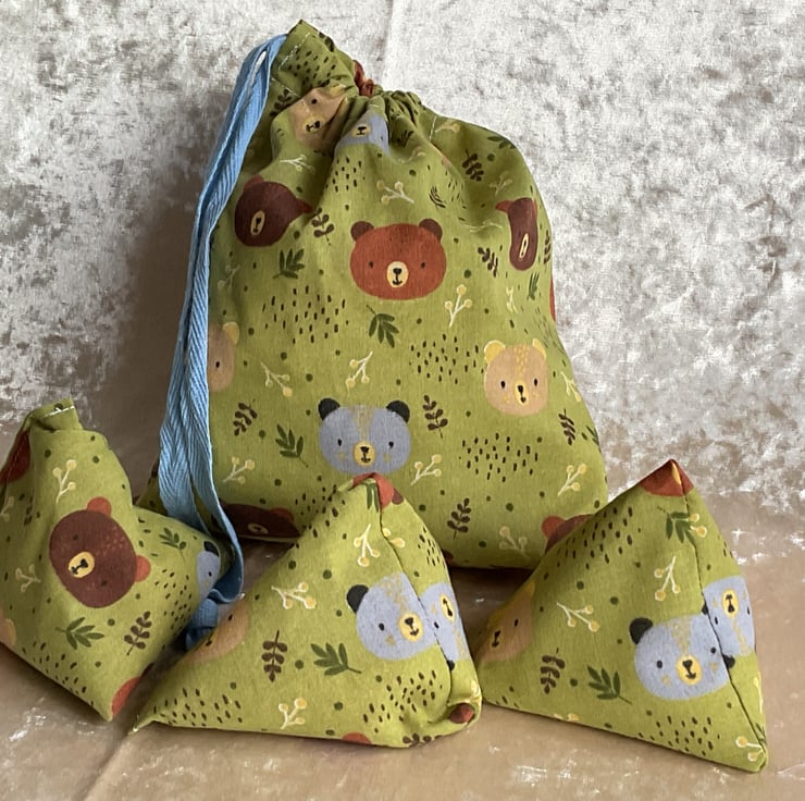 Three little triangle rice filled bean bags that come with a little storage bag to keep them in.