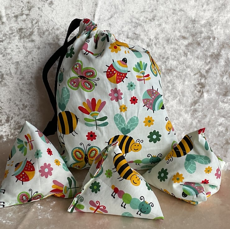 Three little triangle rice filled bean bags that come with a little storage bag to keep them in.