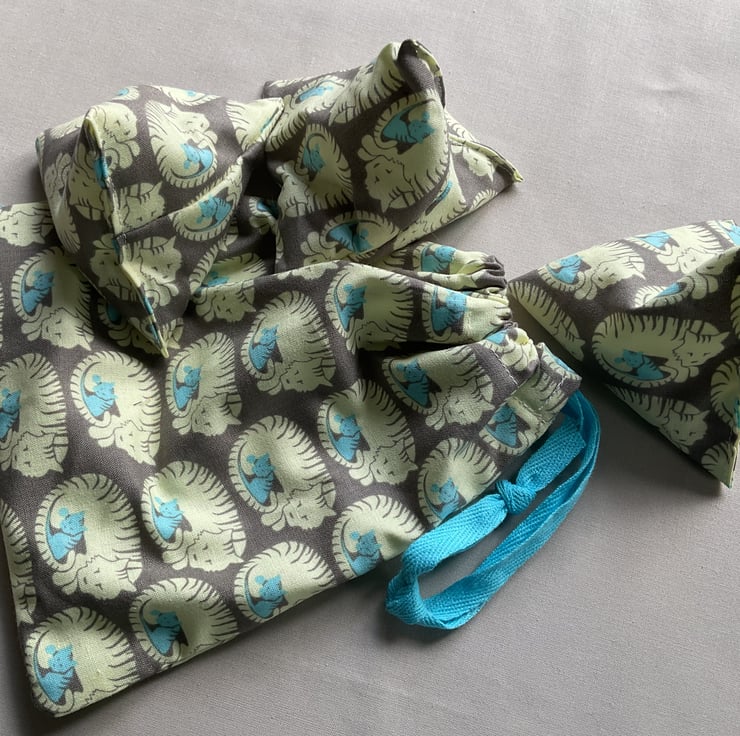 Three little triangle rice filled bean bags that come with a little storage bag to keep them in.