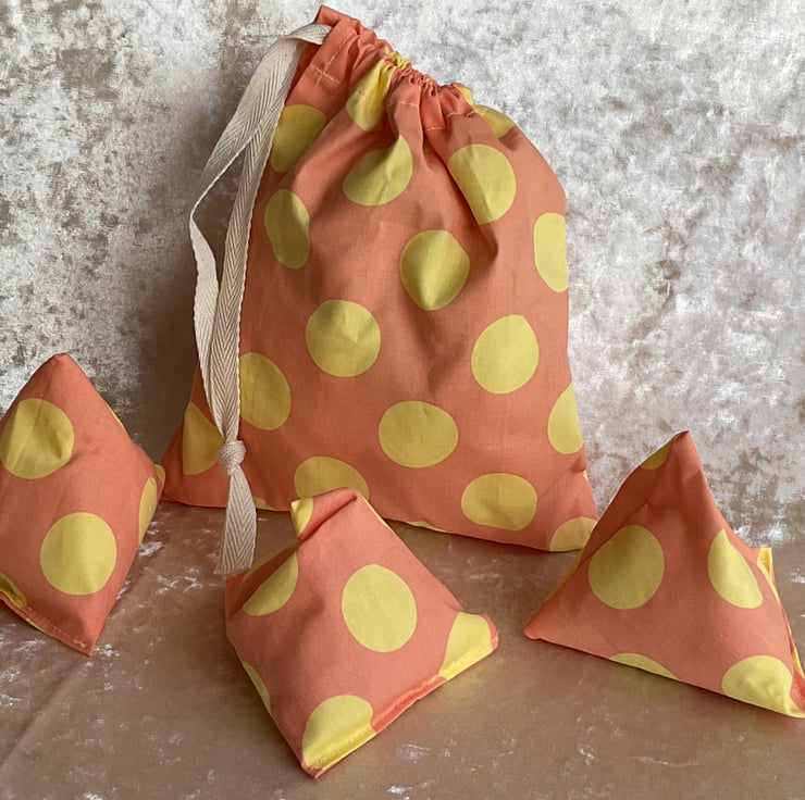 Three little triangle rice filled bean bags that come with a little storage bag to keep them in.