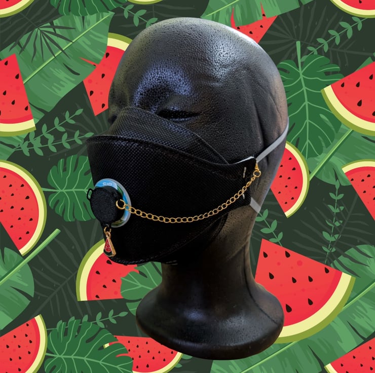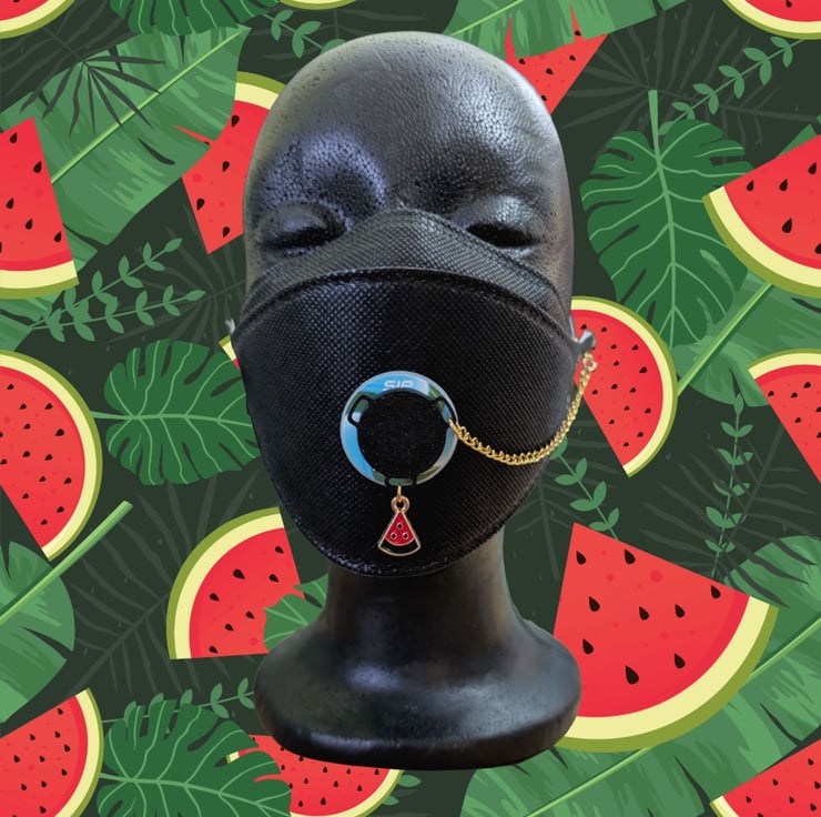 This replacement cap comes with a chain that attaches to your mask, so that you don't have to keep track of where it is. The cap is 3D printed with PLA, and is slightly chunkier and sturdier than the standard caps that come with the SIP valves. It is also slightly textured, with three lugs that make it easier to grip. One of the lugs is adorned with an enamel watermelon charm.