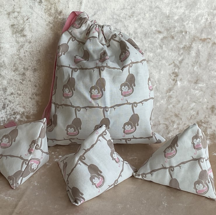 Three little triangle rice filled bean bags that come with a little storage bag to keep them in.